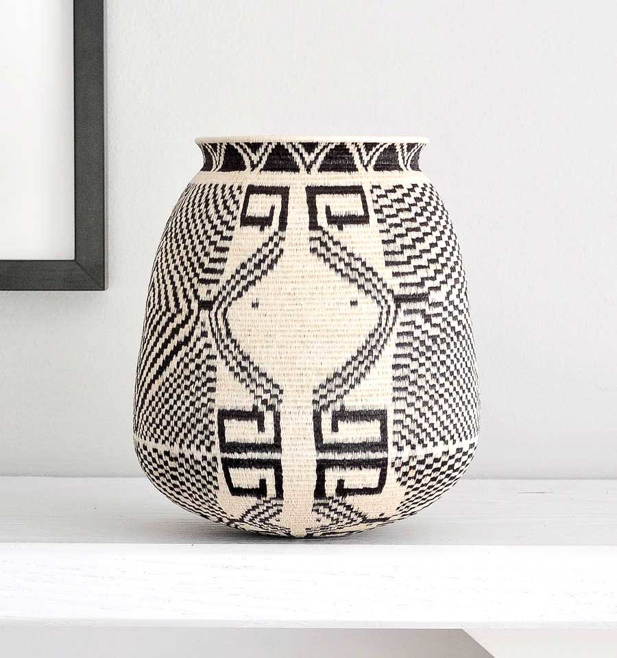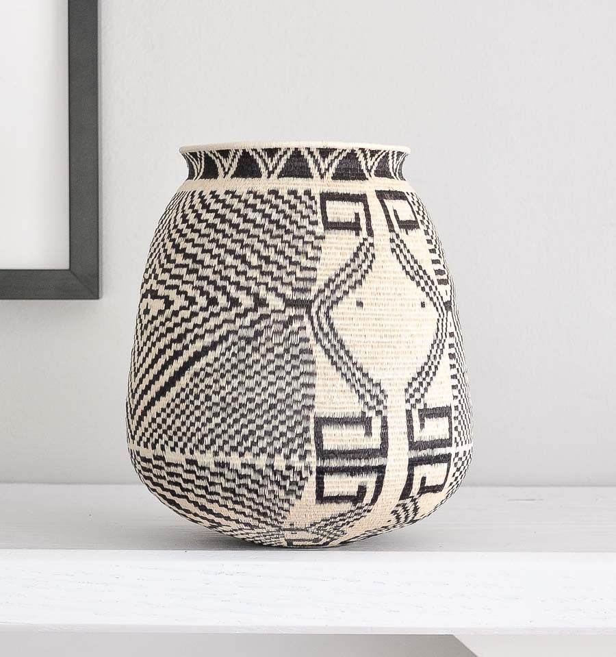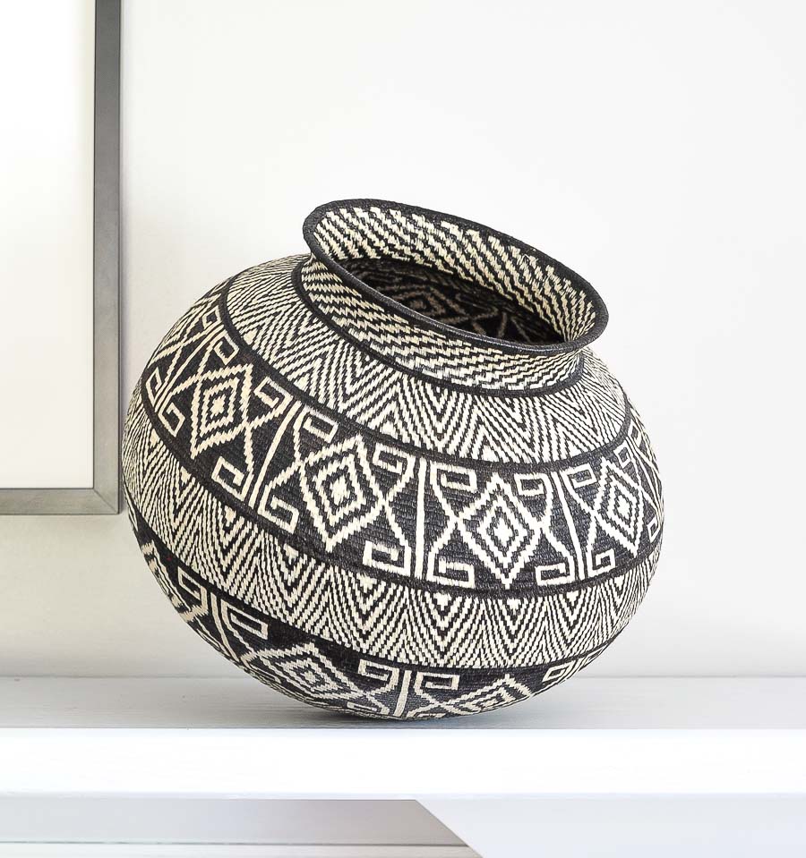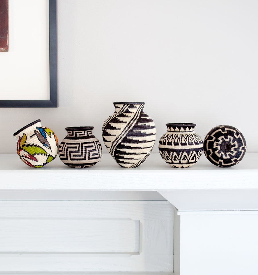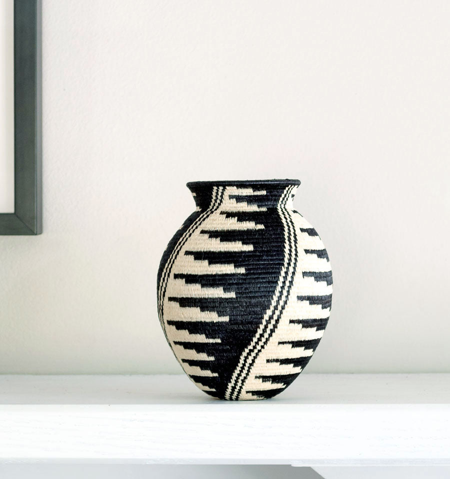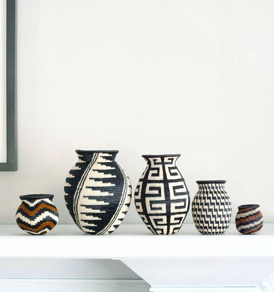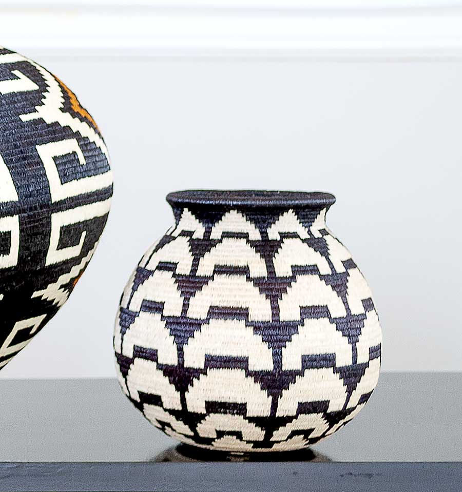 Black and white baskets are handwoven art pieces created by artisans from Panama, Colombia, Rwanda, and Ghana. Using natural fibers and dyes, each basket highlights bold contrasts—stripes, spirals, and diamonds—that make the patterns timeless and modern at once.