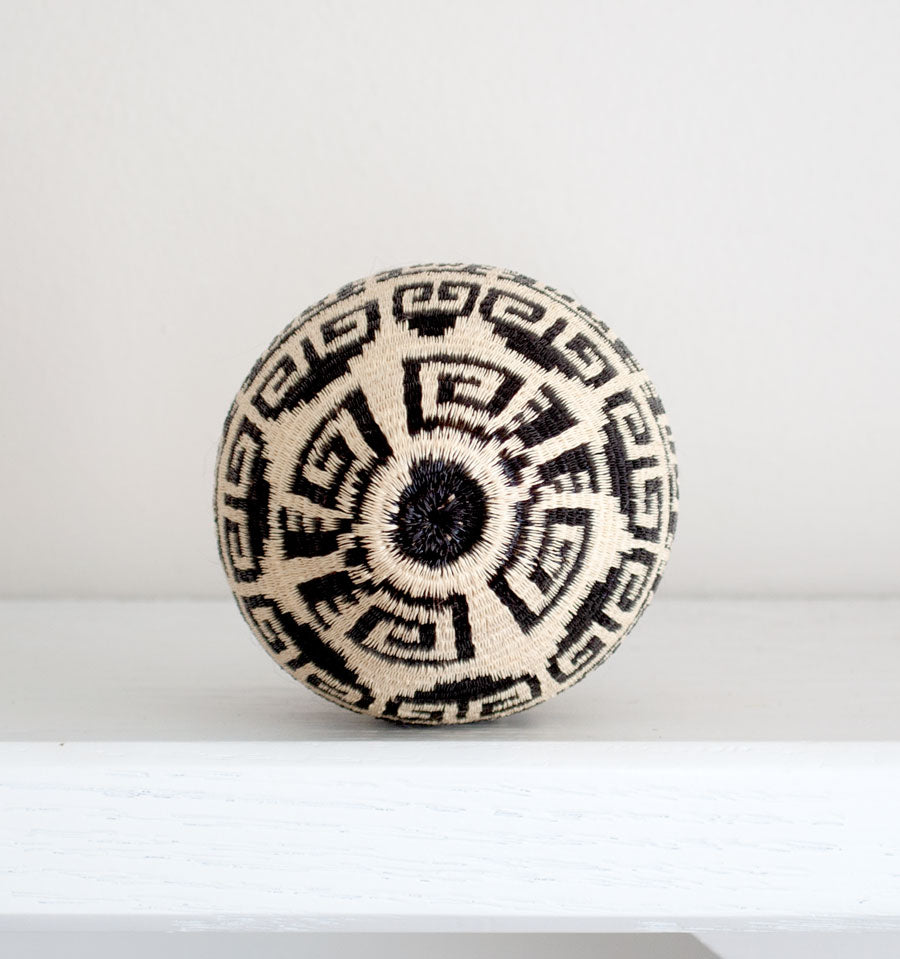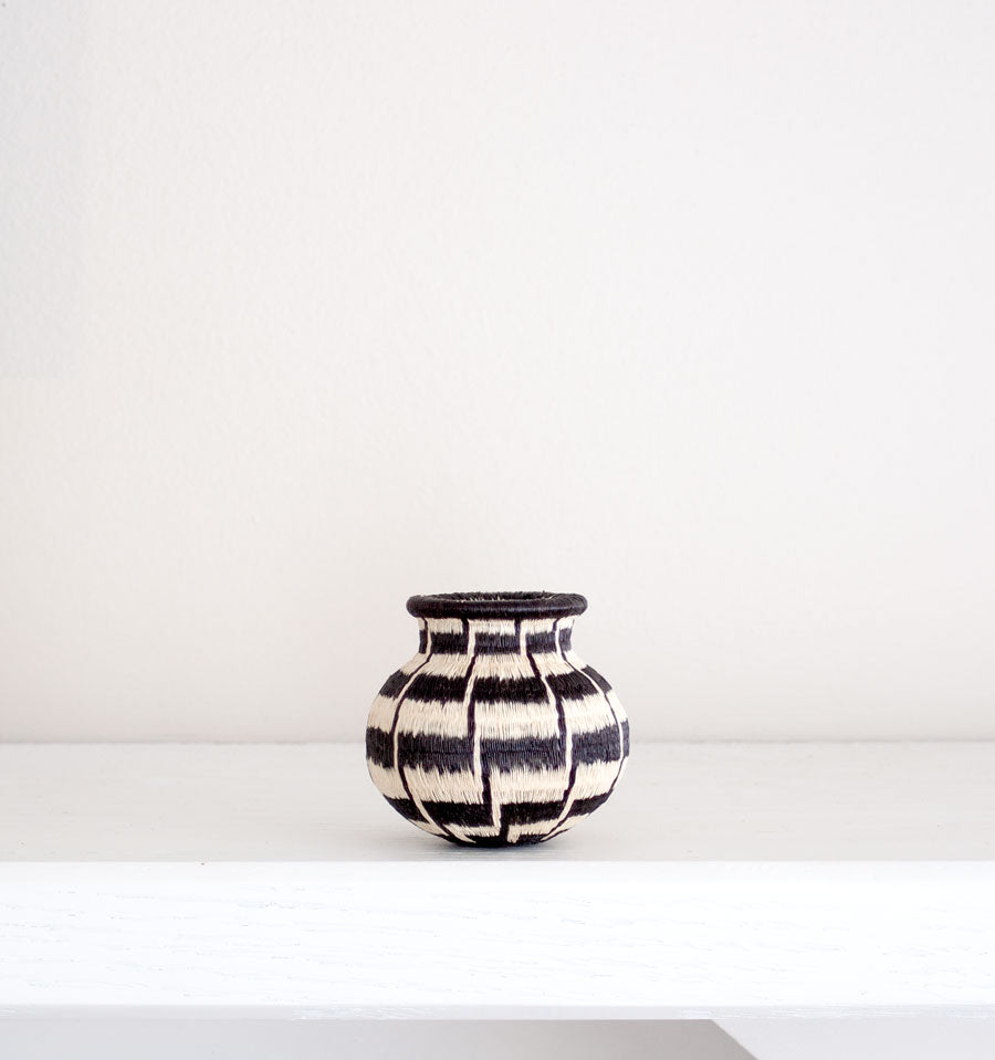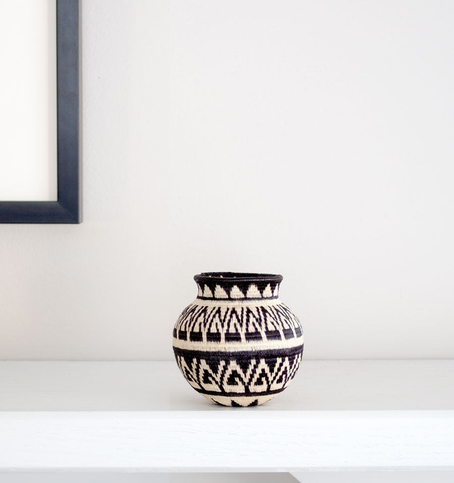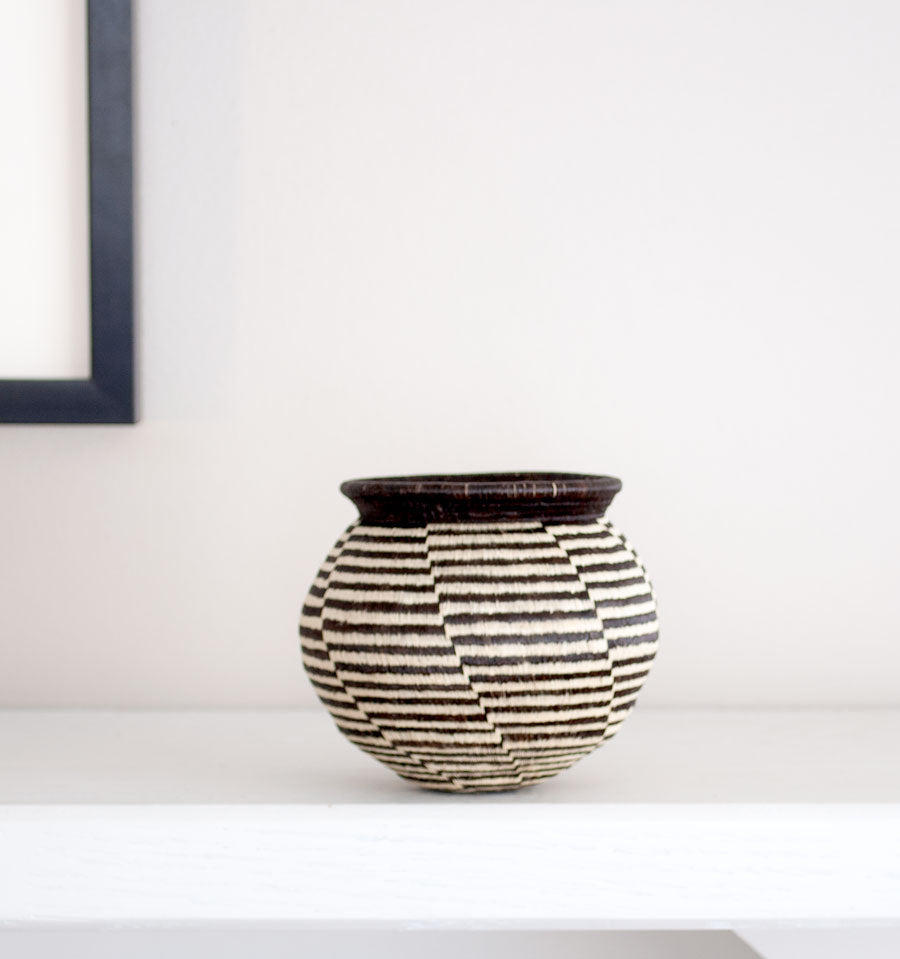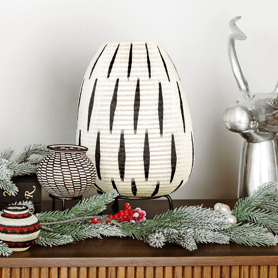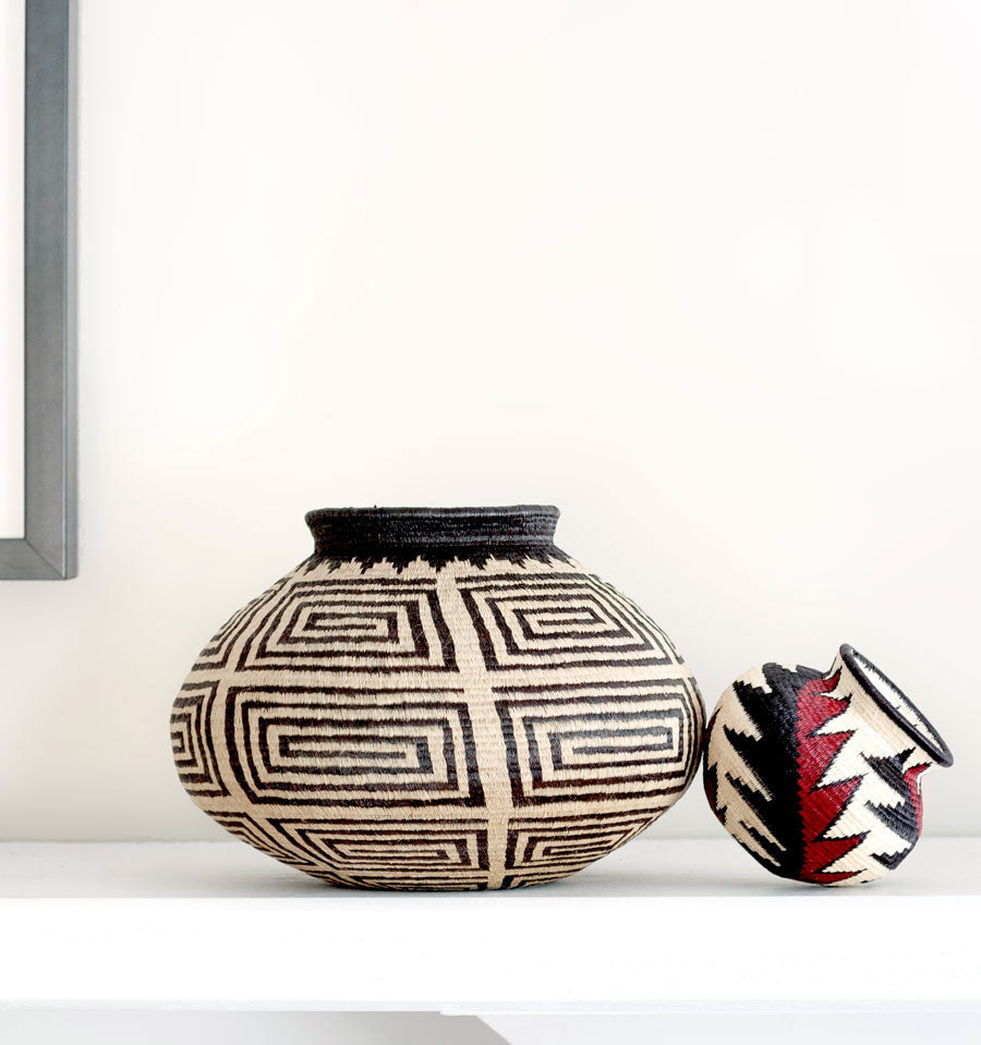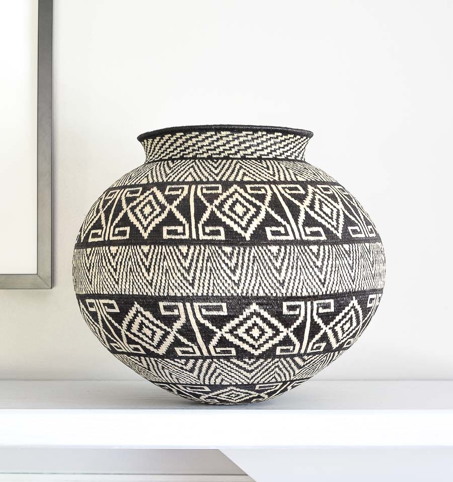 Black and white baskets are handwoven art pieces created by artisans from Panama, Colombia, Rwanda, and Ghana. Using natural fibers and dyes, each basket highlights bold contrasts—stripes, spirals, and diamonds—that make the patterns timeless and modern at once.
