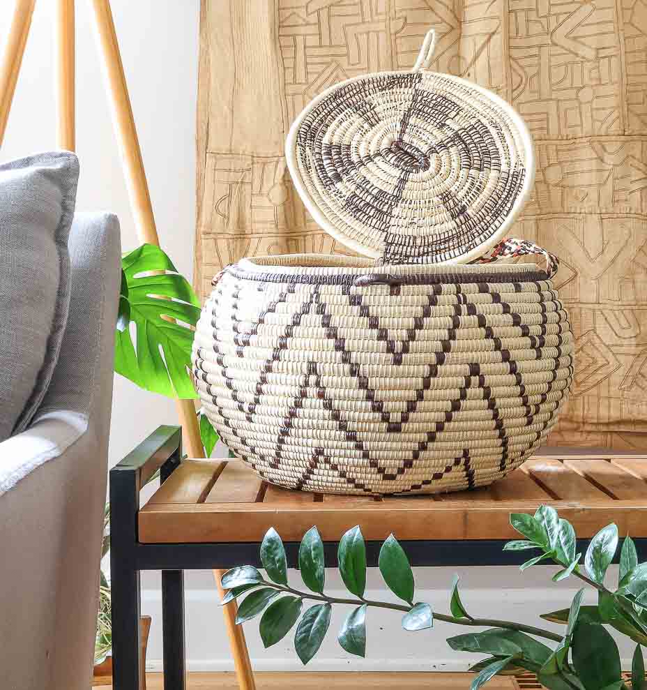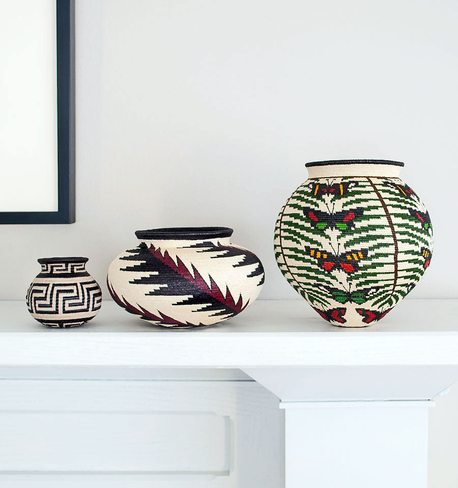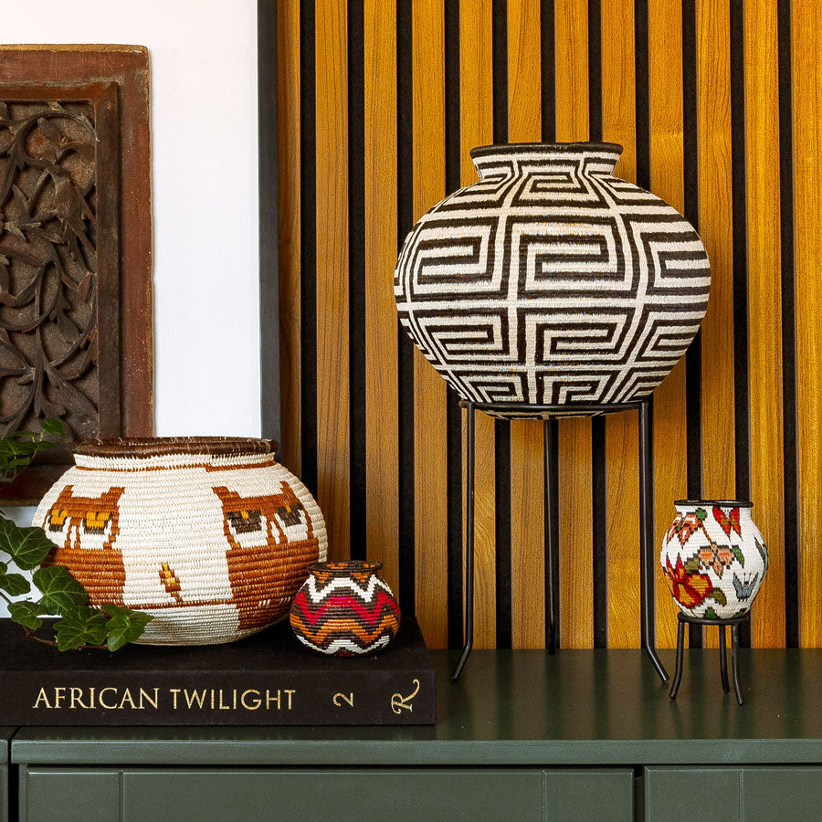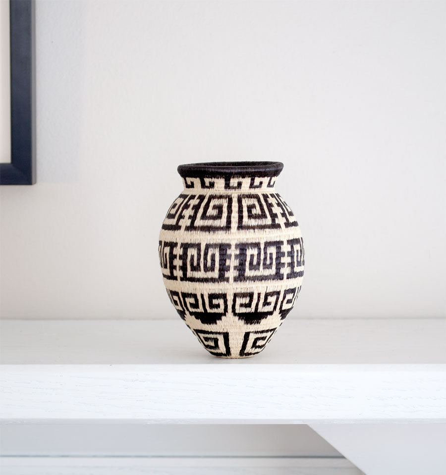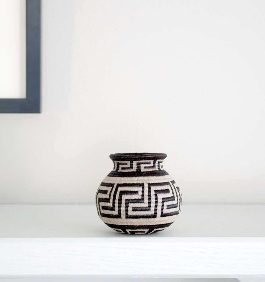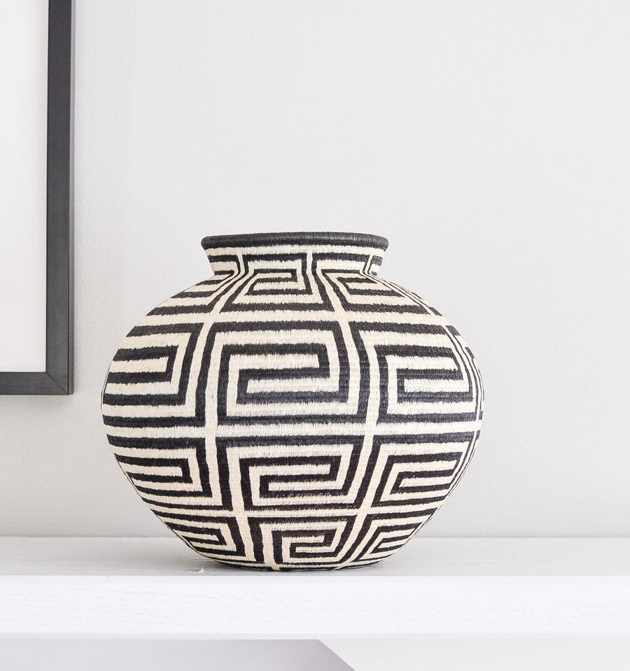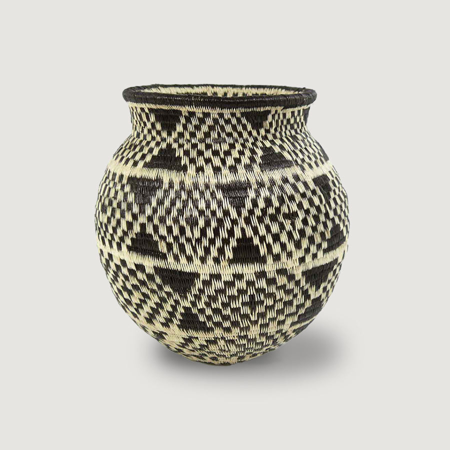 Black and white baskets are handwoven art pieces created by artisans from Panama, Colombia, Rwanda, and Ghana. Using natural fibers and dyes, each basket highlights bold contrasts—stripes, spirals, and diamonds—that make the patterns timeless and modern at once.