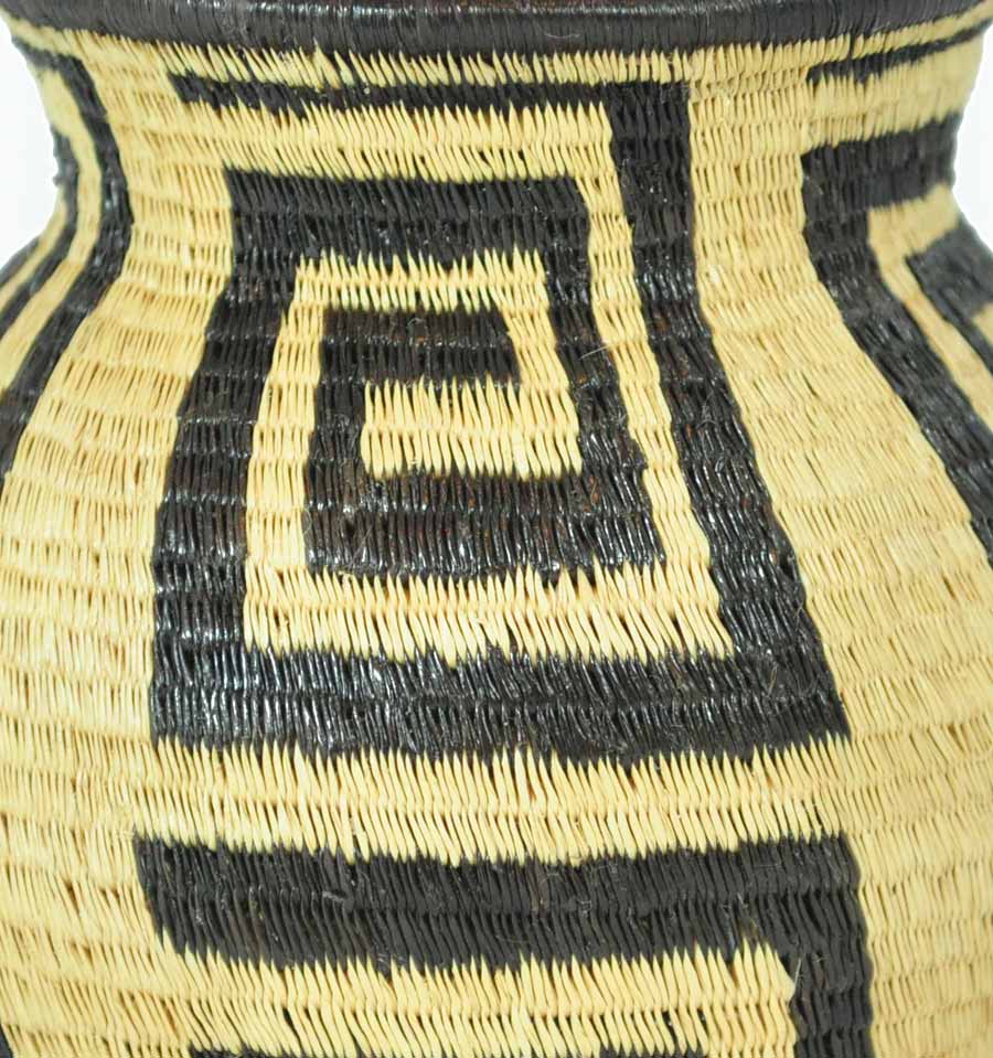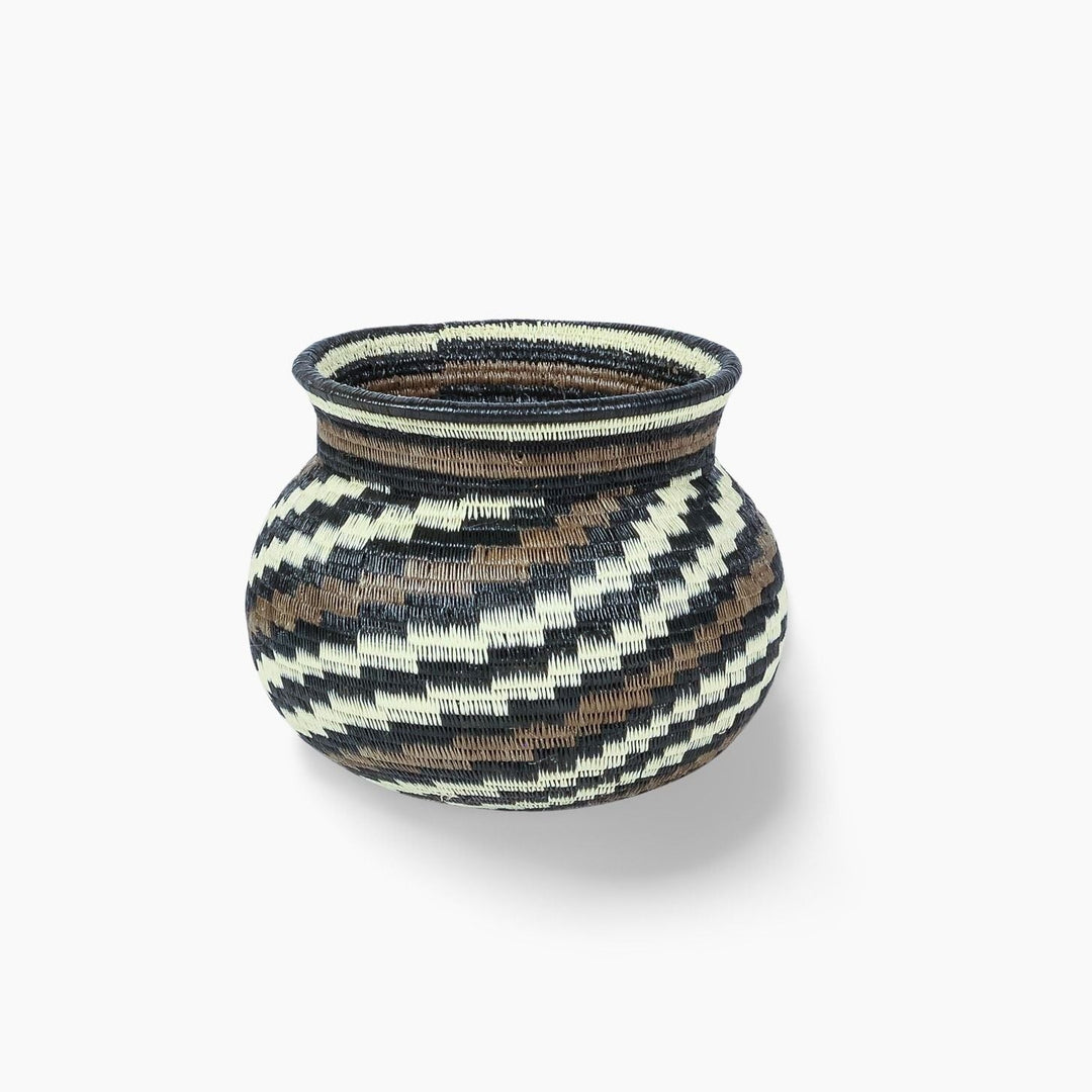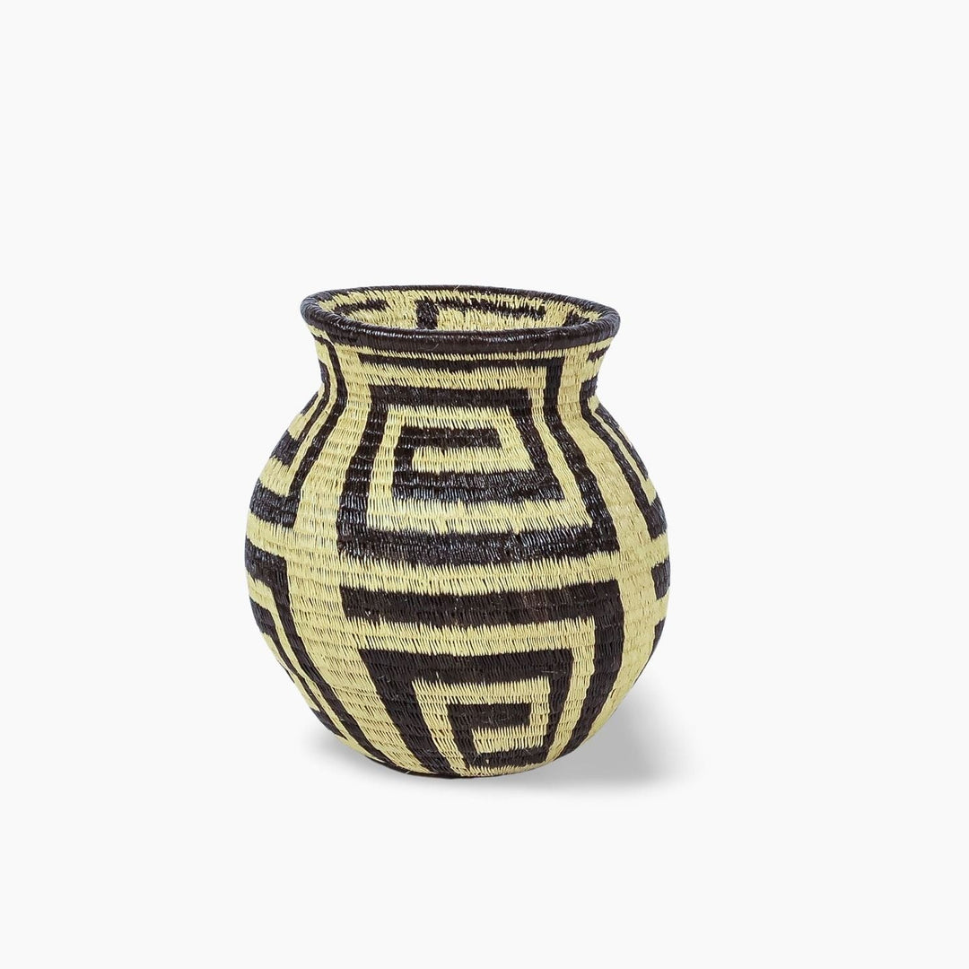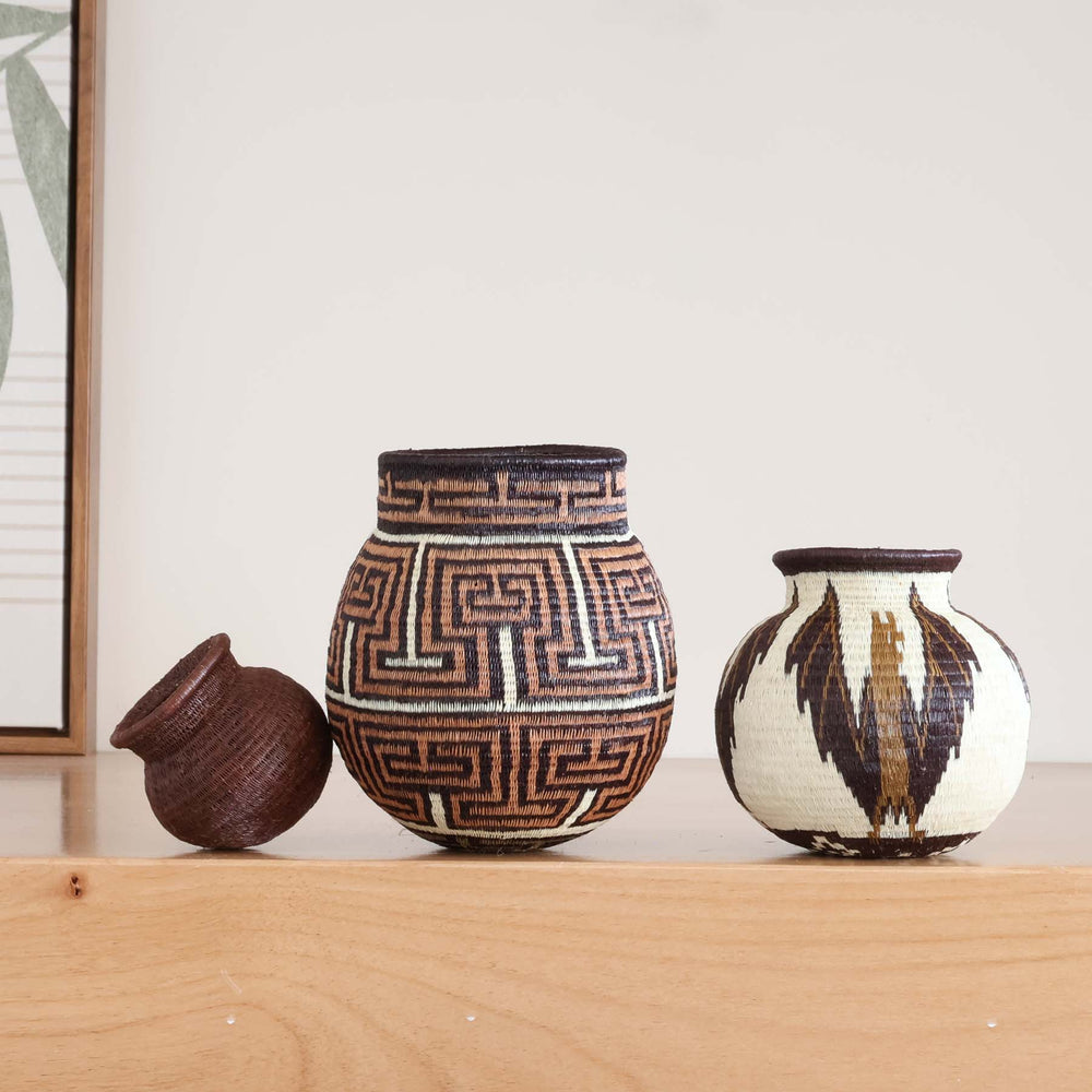 Geometric woven baskets are handmade art pieces created by Wounaan and Embera weavers of Panama and Colombia, and by artisan communities in Rwanda and Ghana. Each basket is formed from natural grasses or palm fibers, stitched or coiled into bold lines, spirals, and diamond motifs that trace back to ancestral body painting, spiritual symbolism, and community traditions.