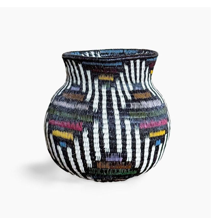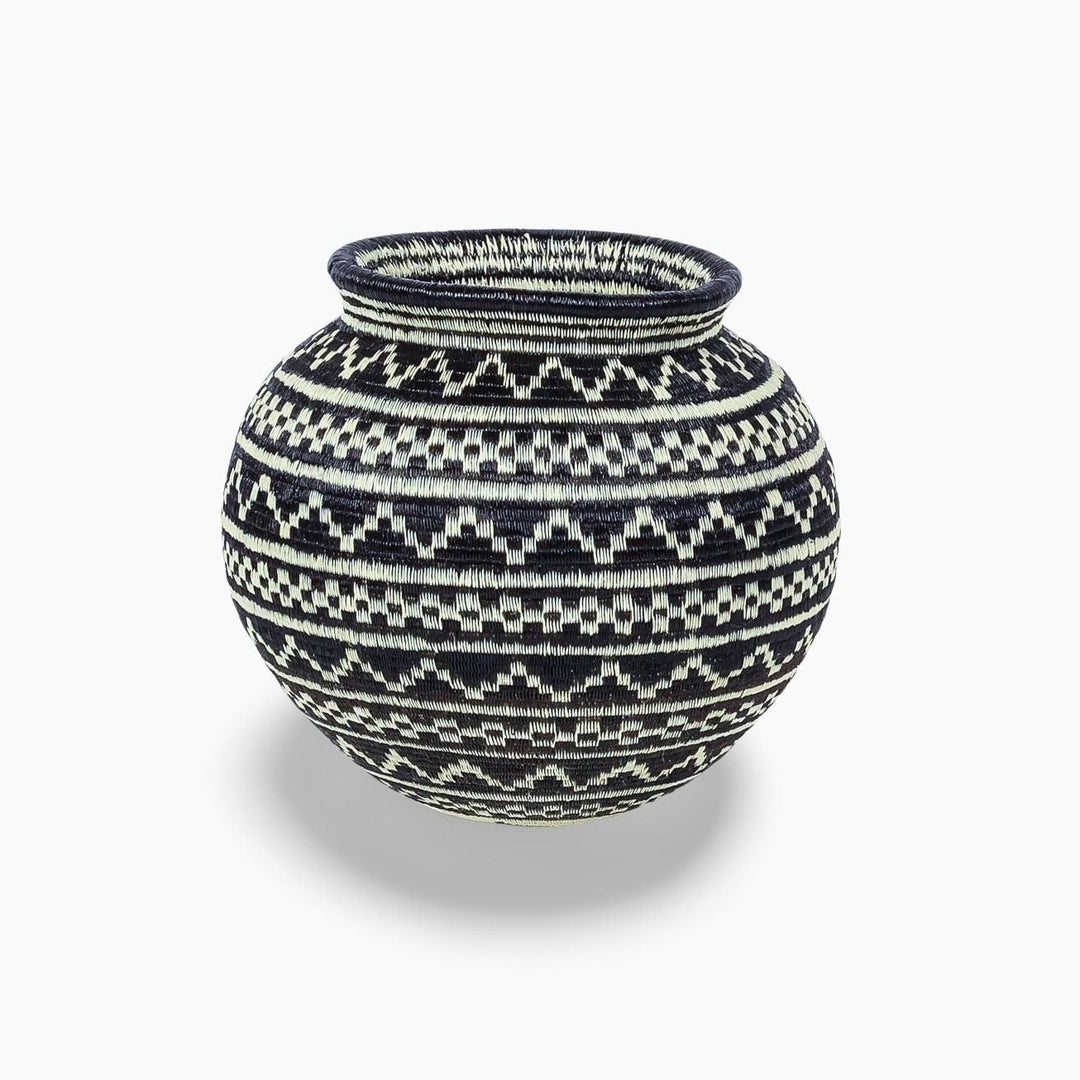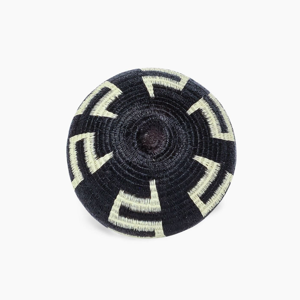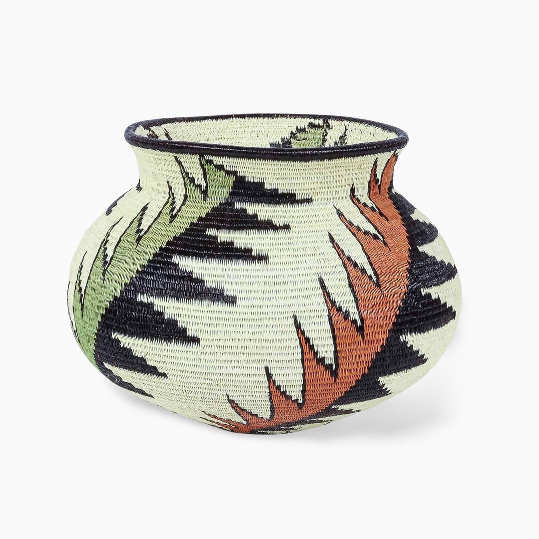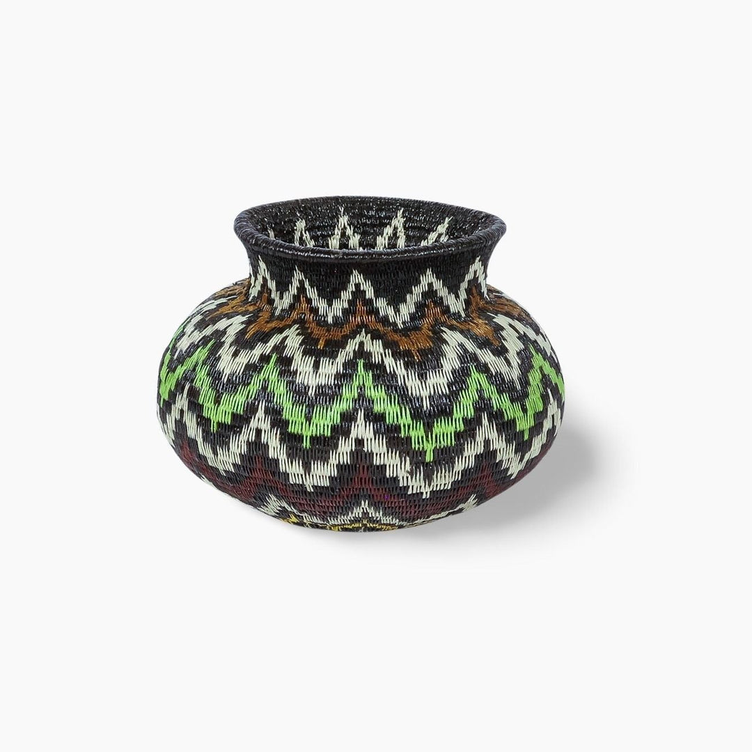 Geometric woven baskets are handmade art pieces created by Wounaan and Embera weavers of Panama and Colombia, and by artisan communities in Rwanda and Ghana. Each basket is formed from natural grasses or palm fibers, stitched or coiled into bold lines, spirals, and diamond motifs that trace back to ancestral body painting, spiritual symbolism, and community traditions.