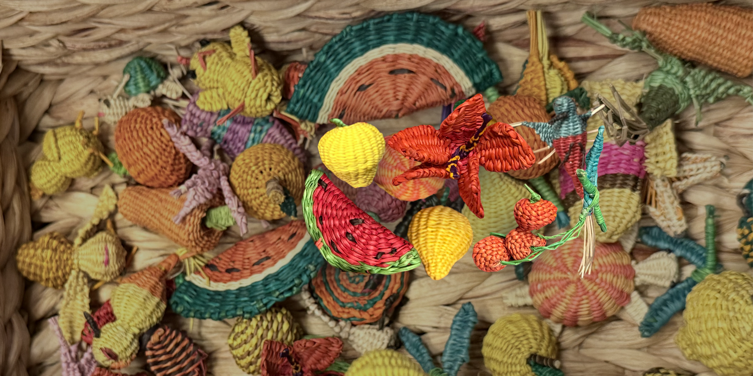 Handwoven out of shredded palm fronds, shaped into tiny fruits, birds, fish and more.
