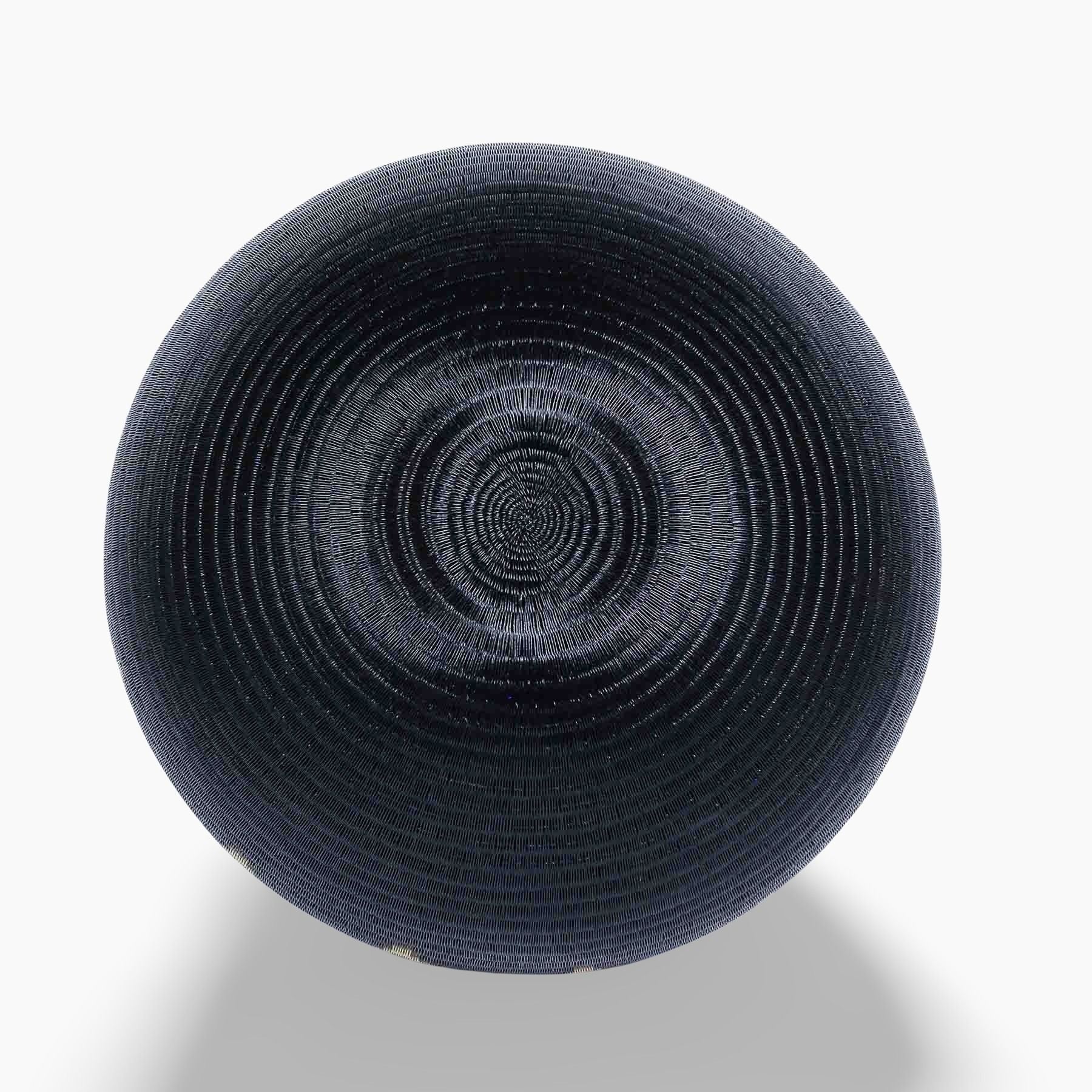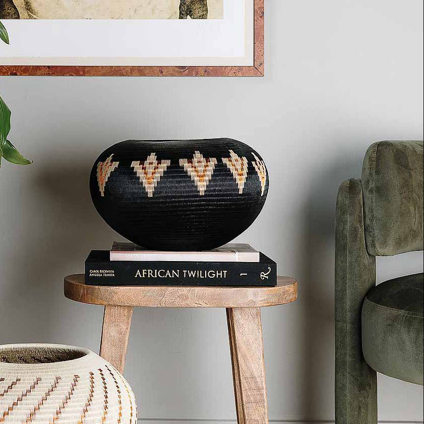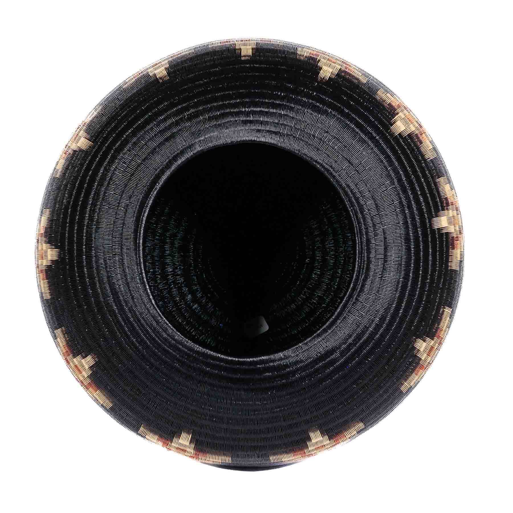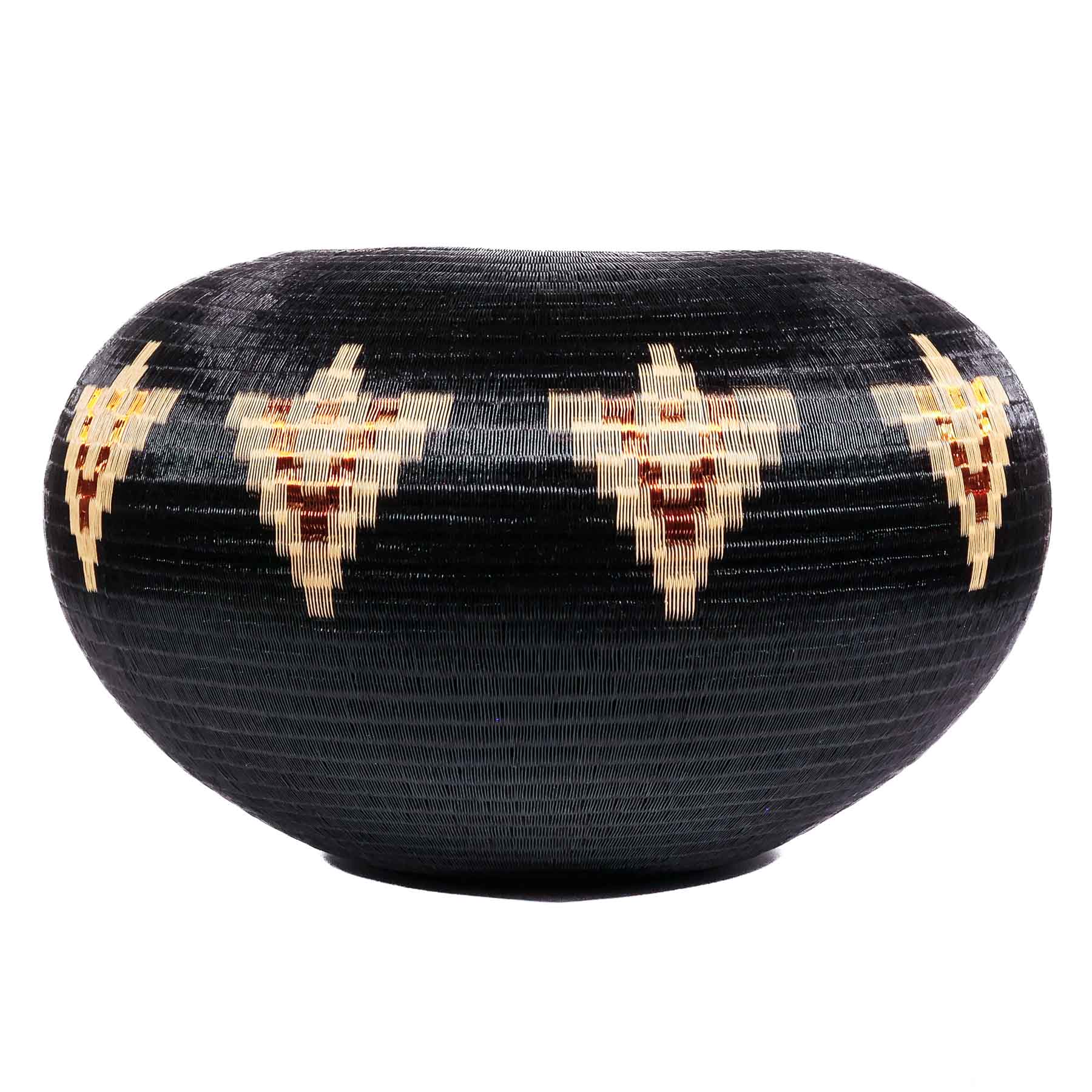 A handwoven Colombian basket featuring warm copper bands against a deep charcoal ground. Sculptural and refined, ideal as a centerpiece or collector accent.