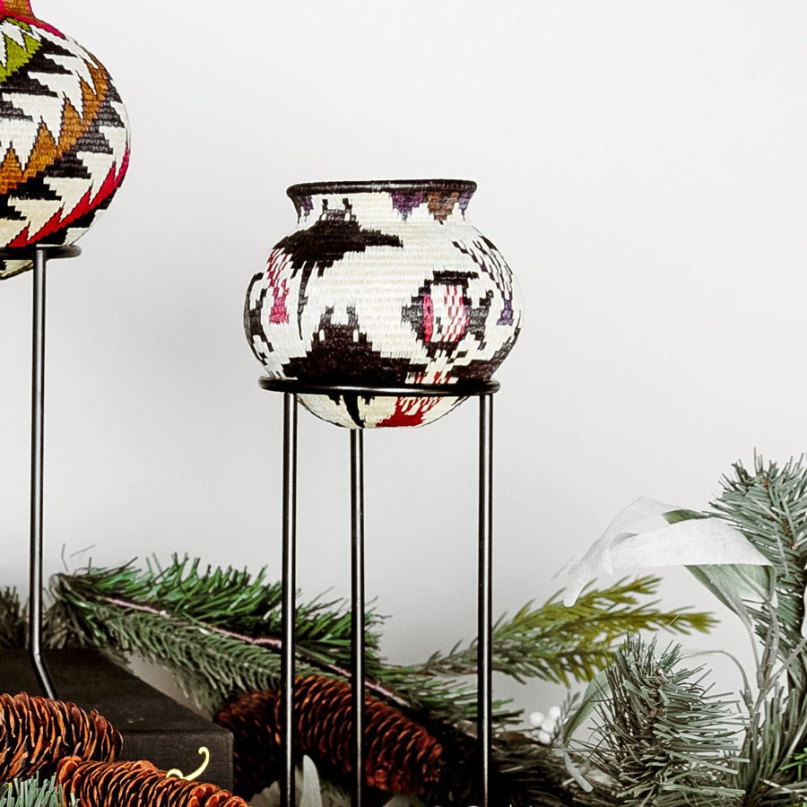 Inspired by the branching forms of coral, this basket layers interlocking diamonds and points in warm sand, coral, and black. The repeating lattice flows seamlessly around the form, creating a sense of movement that feels both organic and graphic. Compact yet visually rich, it brings a quiet coastal energy to shelves, desks, or small display spaces.