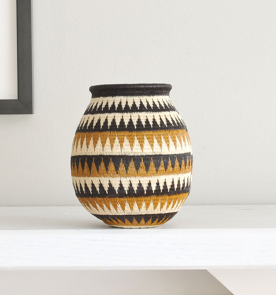 Thin rows of black and brown diamonds alternate up the height of this smaller basket. Pointed triangles show tiny stitching that comes to a sharp end.