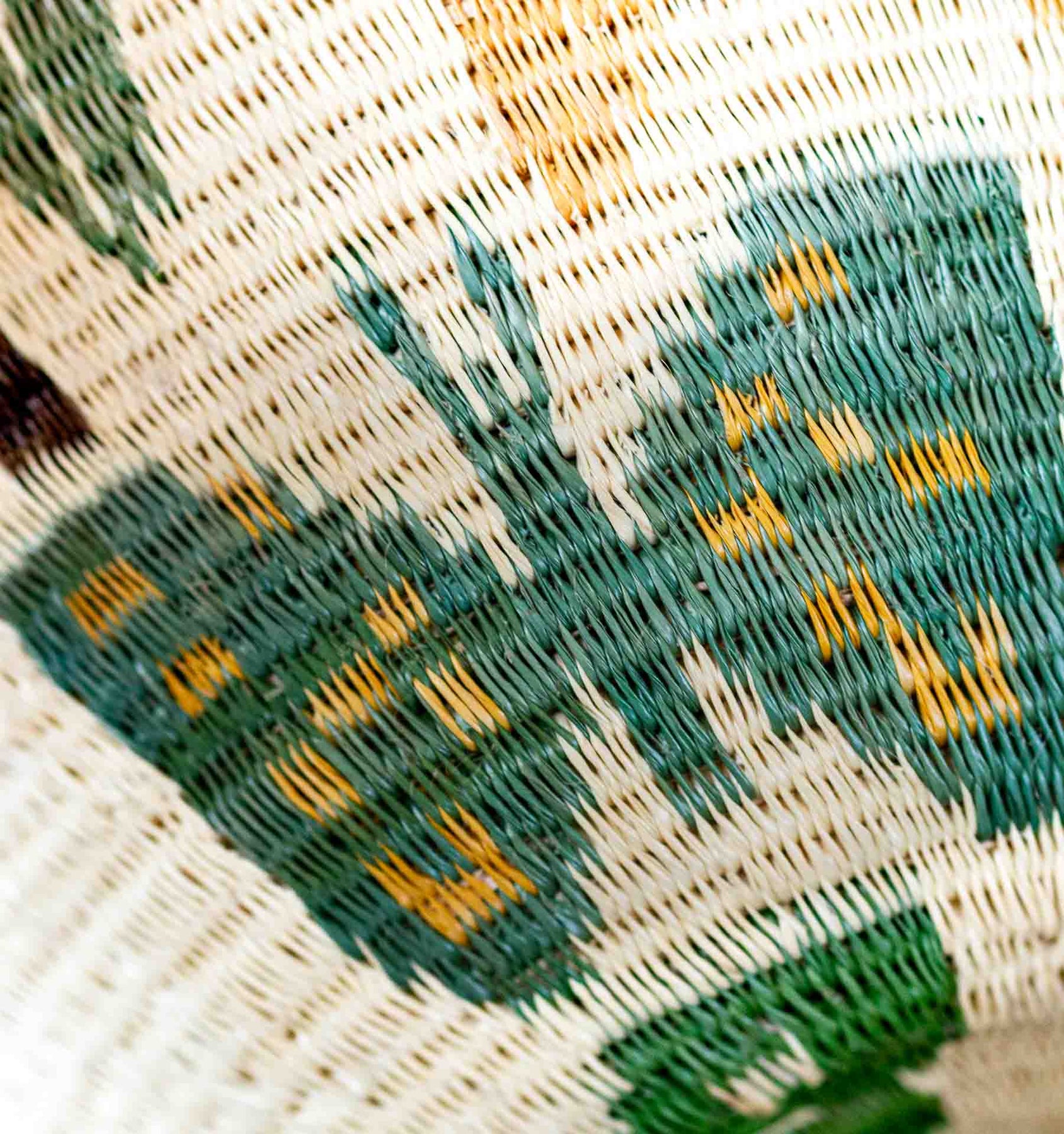 Close-up of butterfly motif in green and yellow on Panama Wounaan basket