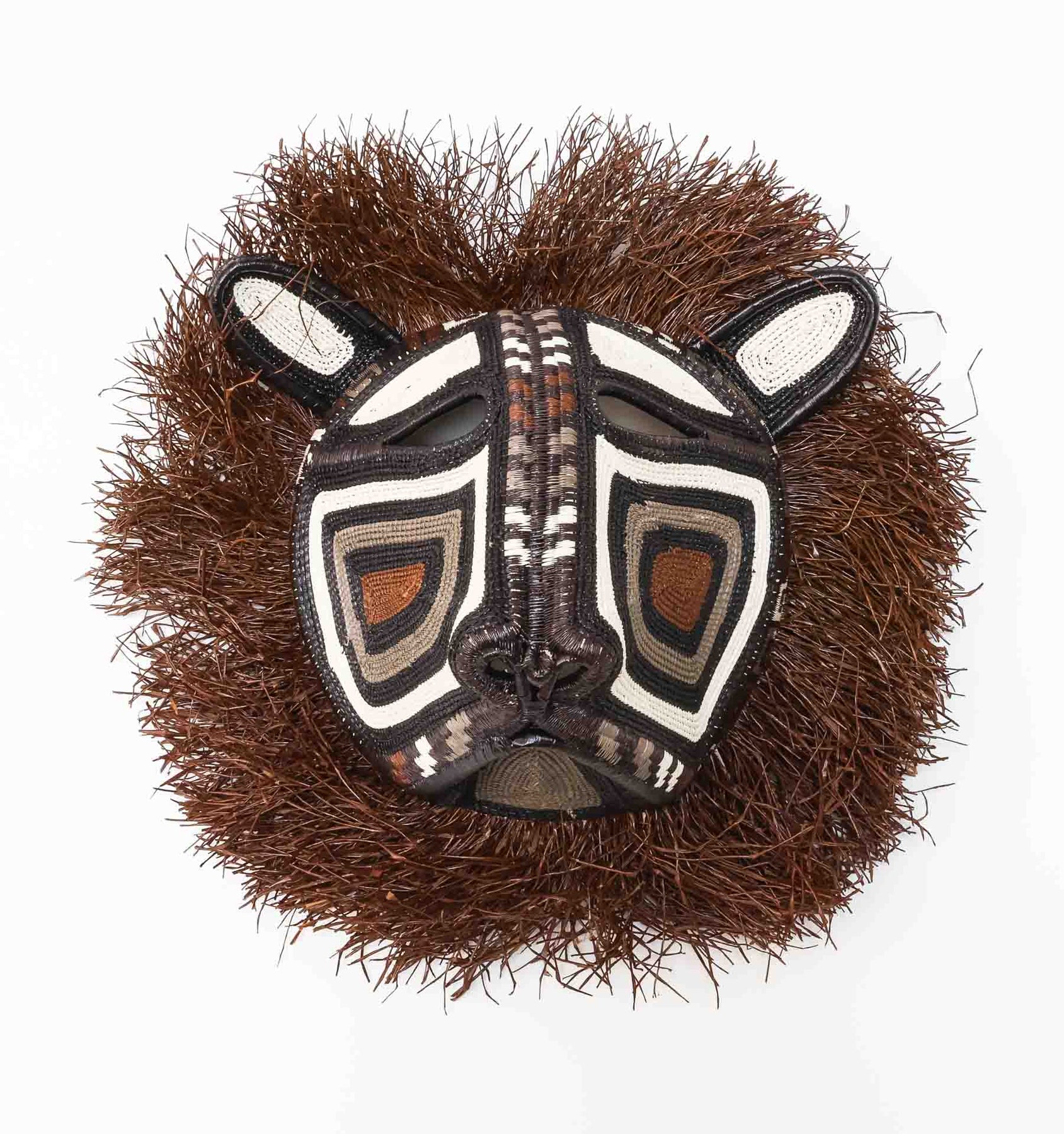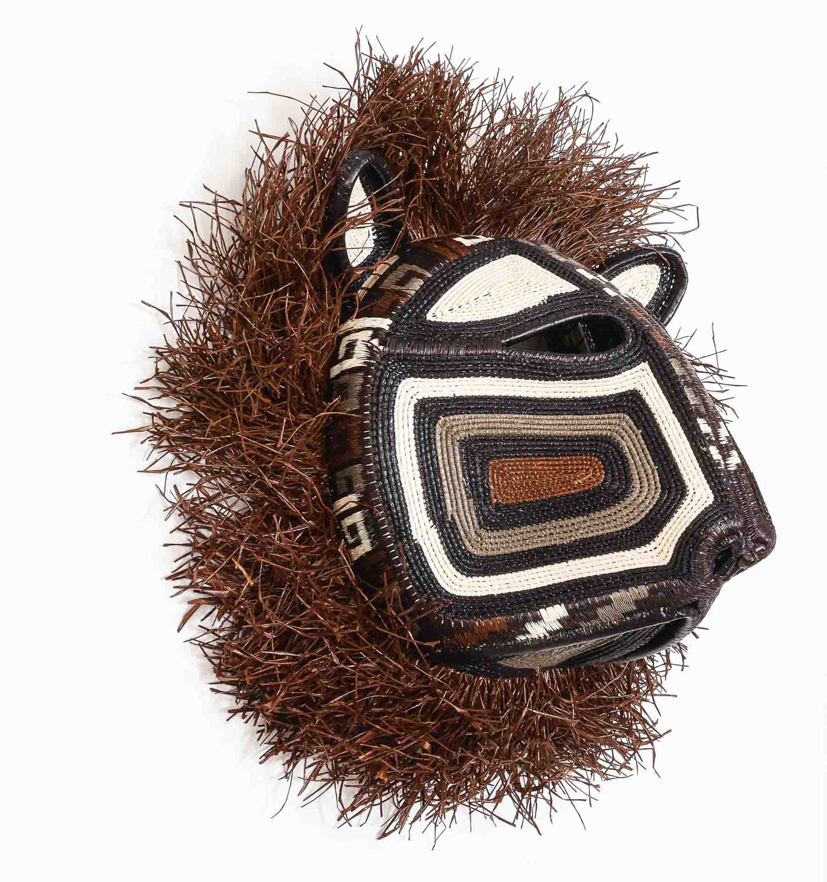 Forest Guardian Cat Mask, 13" woven art by Embera weaver Felicinda Guaynora, Panama palm fiber feline mask with concentric ivory, brown, and black design and fiber mane.