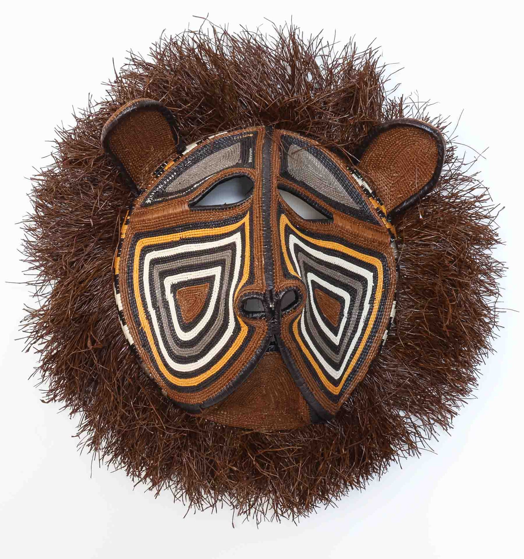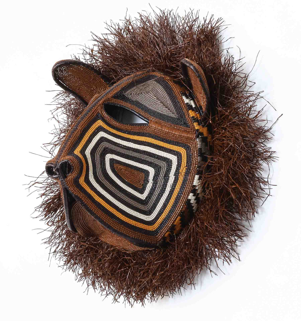 A commanding feline mask with a radiating fiber mane, its face defined by bold concentric lines of brown, ivory, black, and ochre. The rounded ears and wide muzzle give the mask presence, while the shaggy fiber fringe frames it in untamed energy, echoing both feline fur and the spirit of the forest.