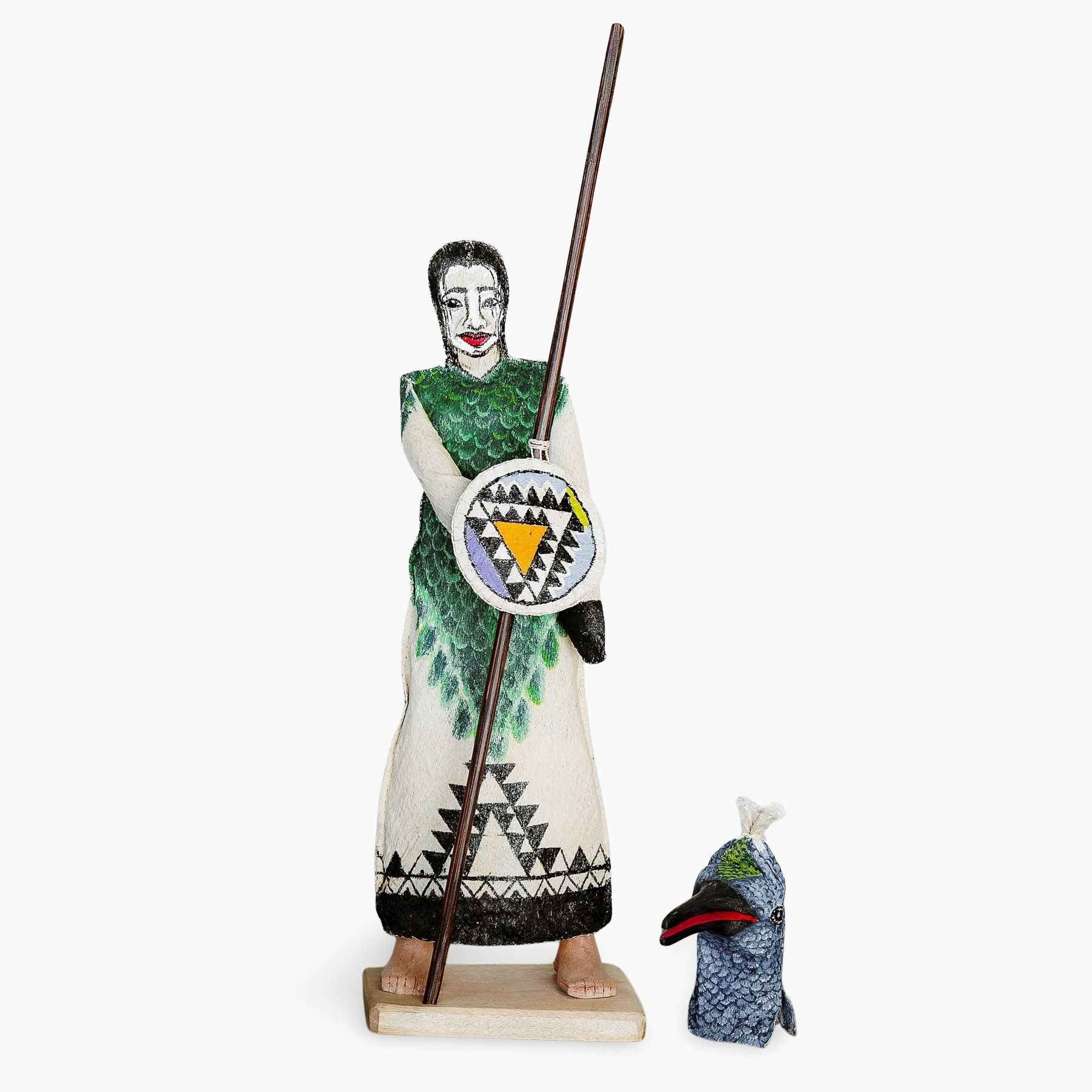 Hummingbird Sentinel is a hand-carved Ticuna ceremonial doll from the Colombian Amazon, featuring a heron mask and a patterned shield and tall staff. The mask is removable to reveal the face beneath, echoing the coming-of-age ceremony where mask wearing marks transformation.