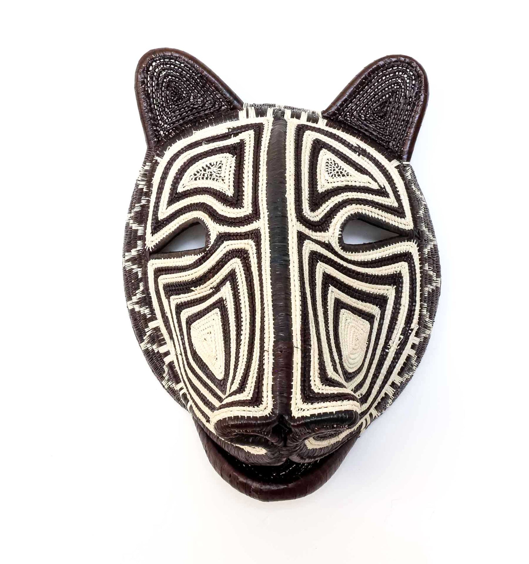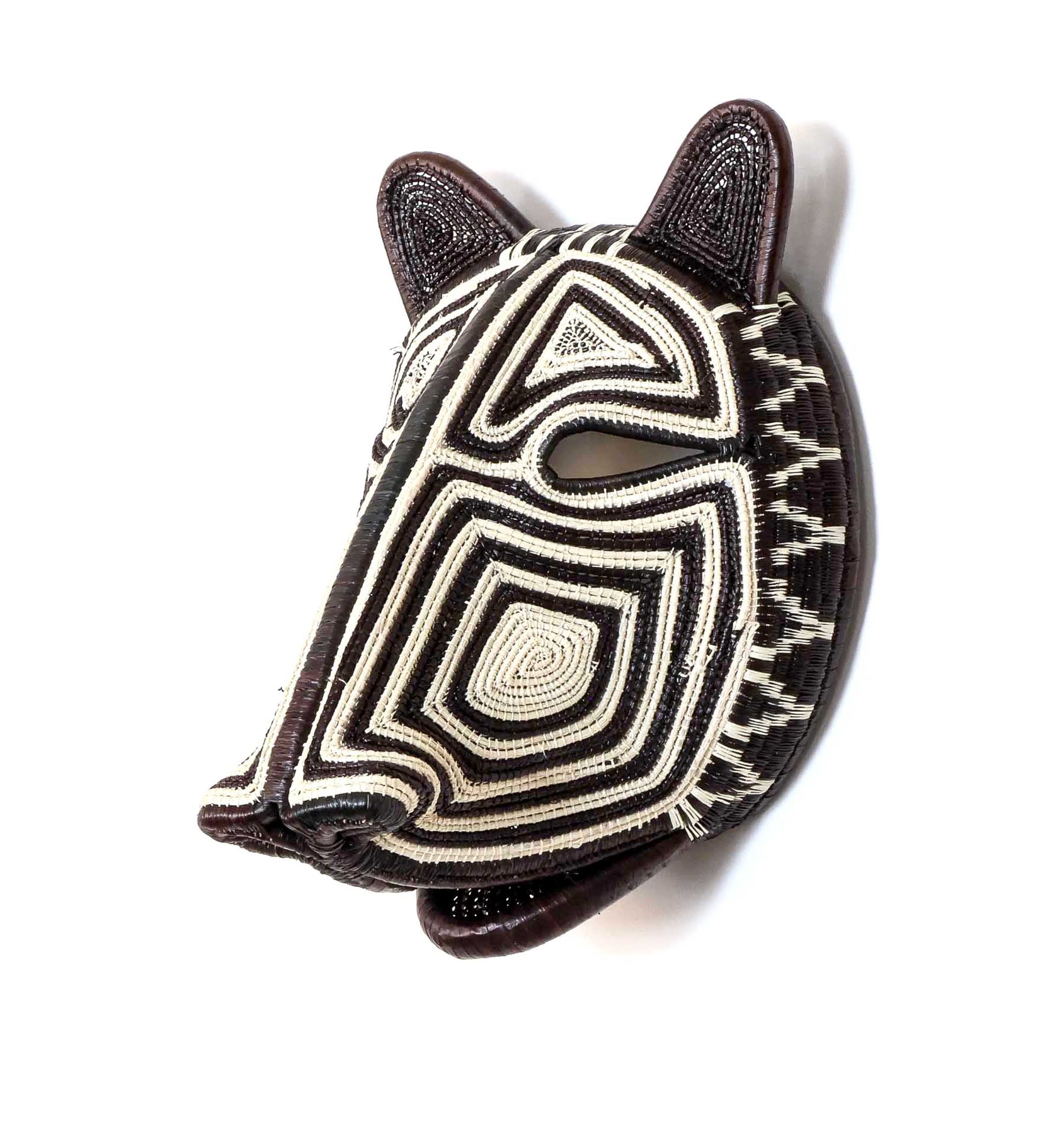 Side angle of Embera woven cat mask in black and ivory fibers