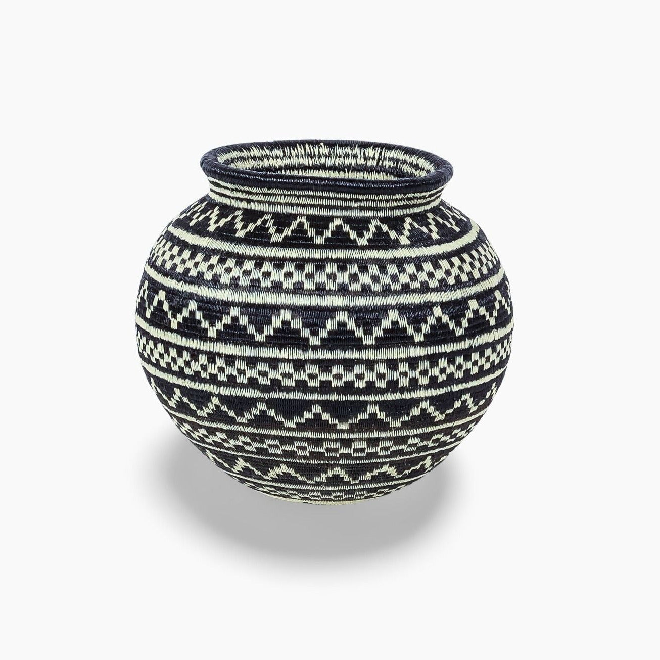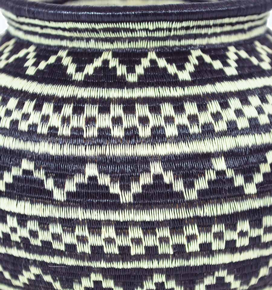 Bands of dark and light fibers repeat across this rounded basket in measured rhythm. The pattern creates depth while maintaining a quiet, sculptural balance.