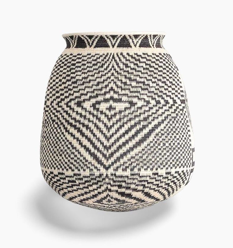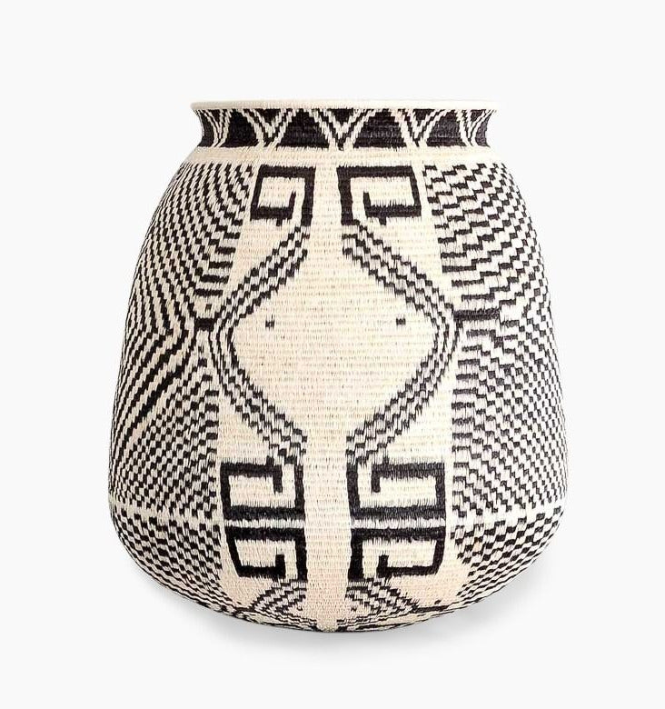 This striking Wounaan basket features an intricate radiating pattern that creates a sense of movement and depth. Black geometric forms expand outward across a natural background, showcasing extraordinary technical skill and visual harmony. Its refined shape and crisp contrast make it a standout collector’s piece.