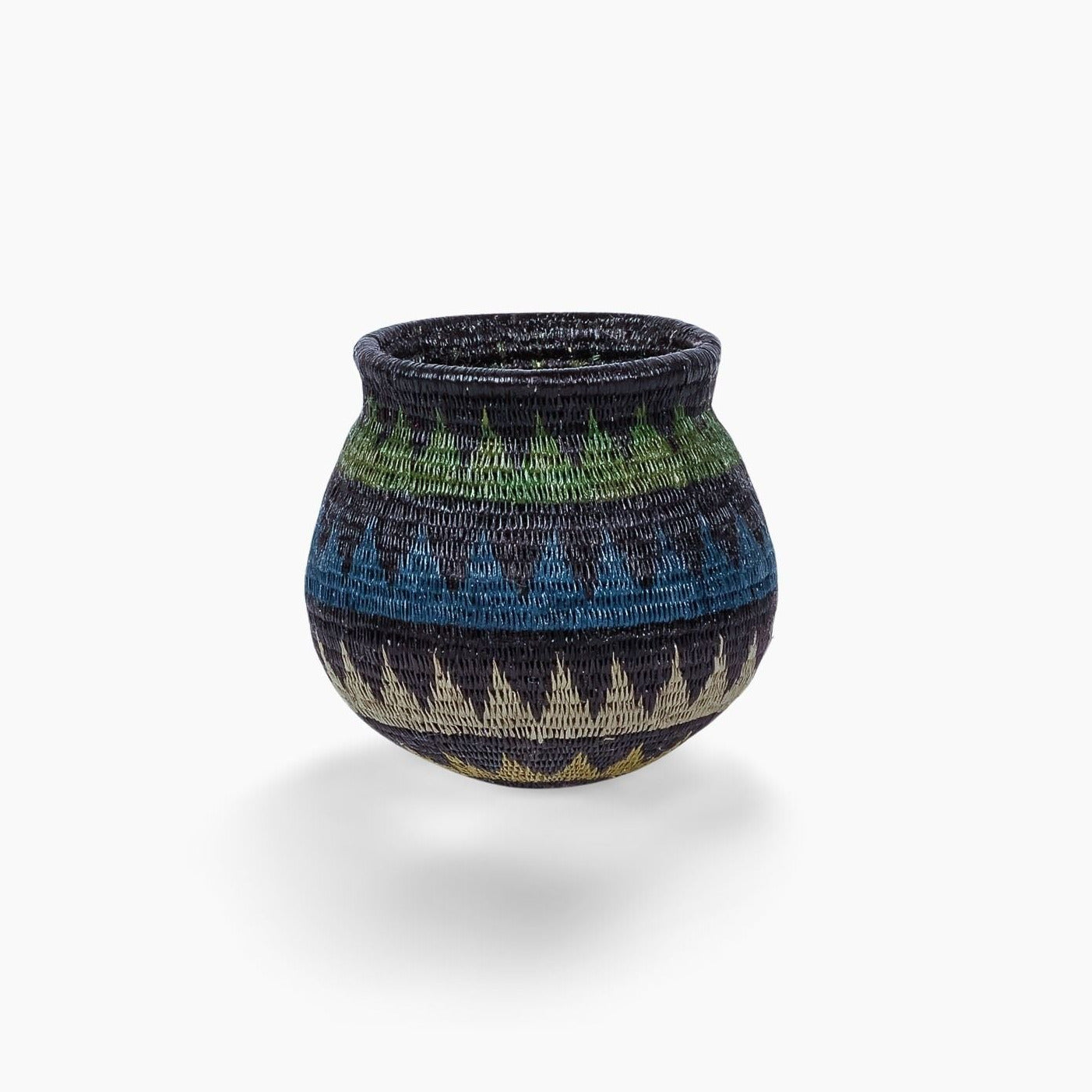 Layered bands of blue, green, and dark fibers ripple across this basket’s rounded form. The palette suggests water and movement rendered in weave.
