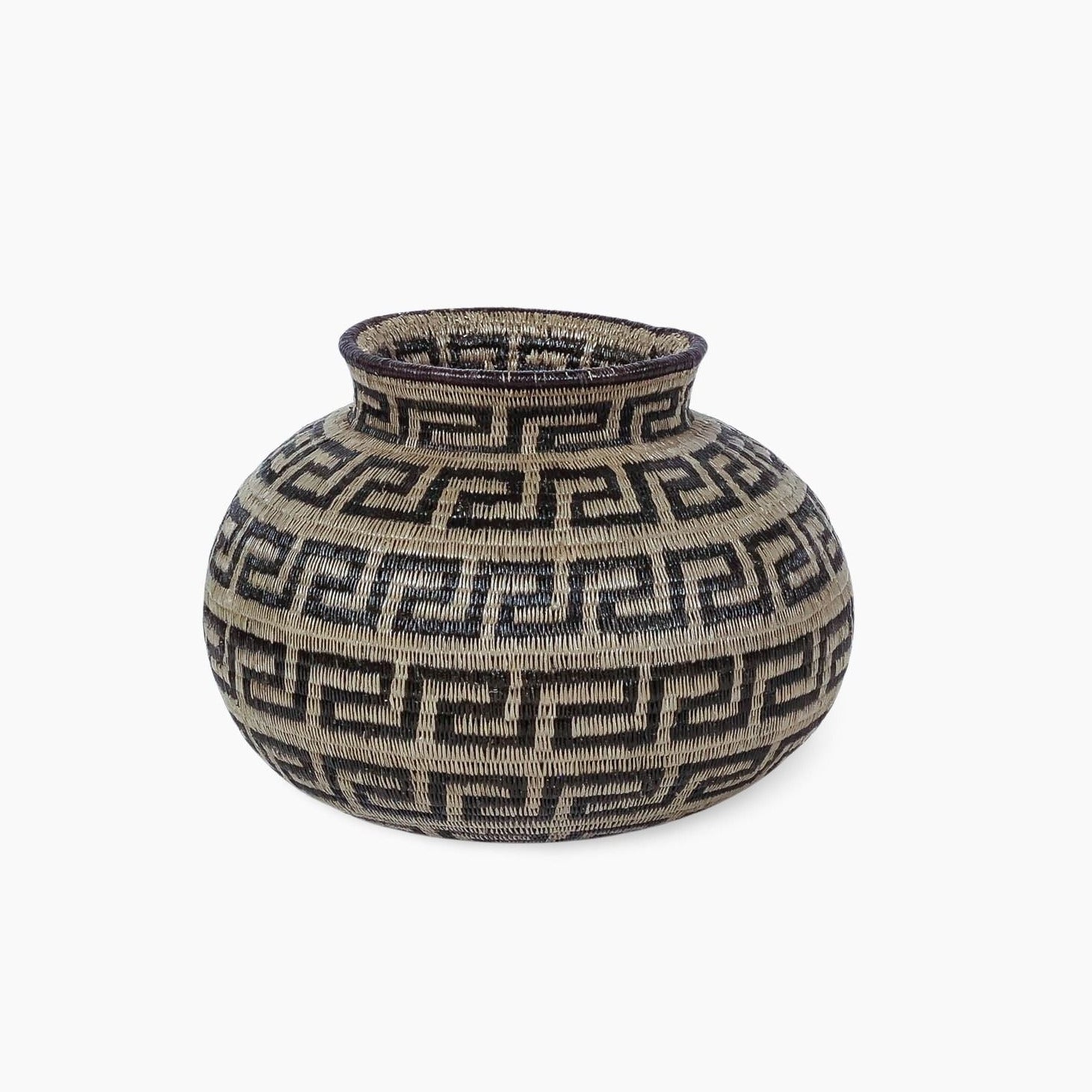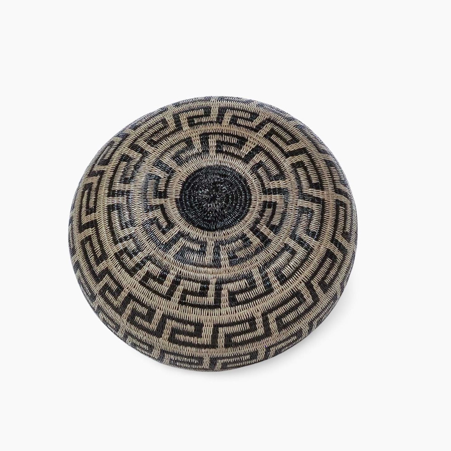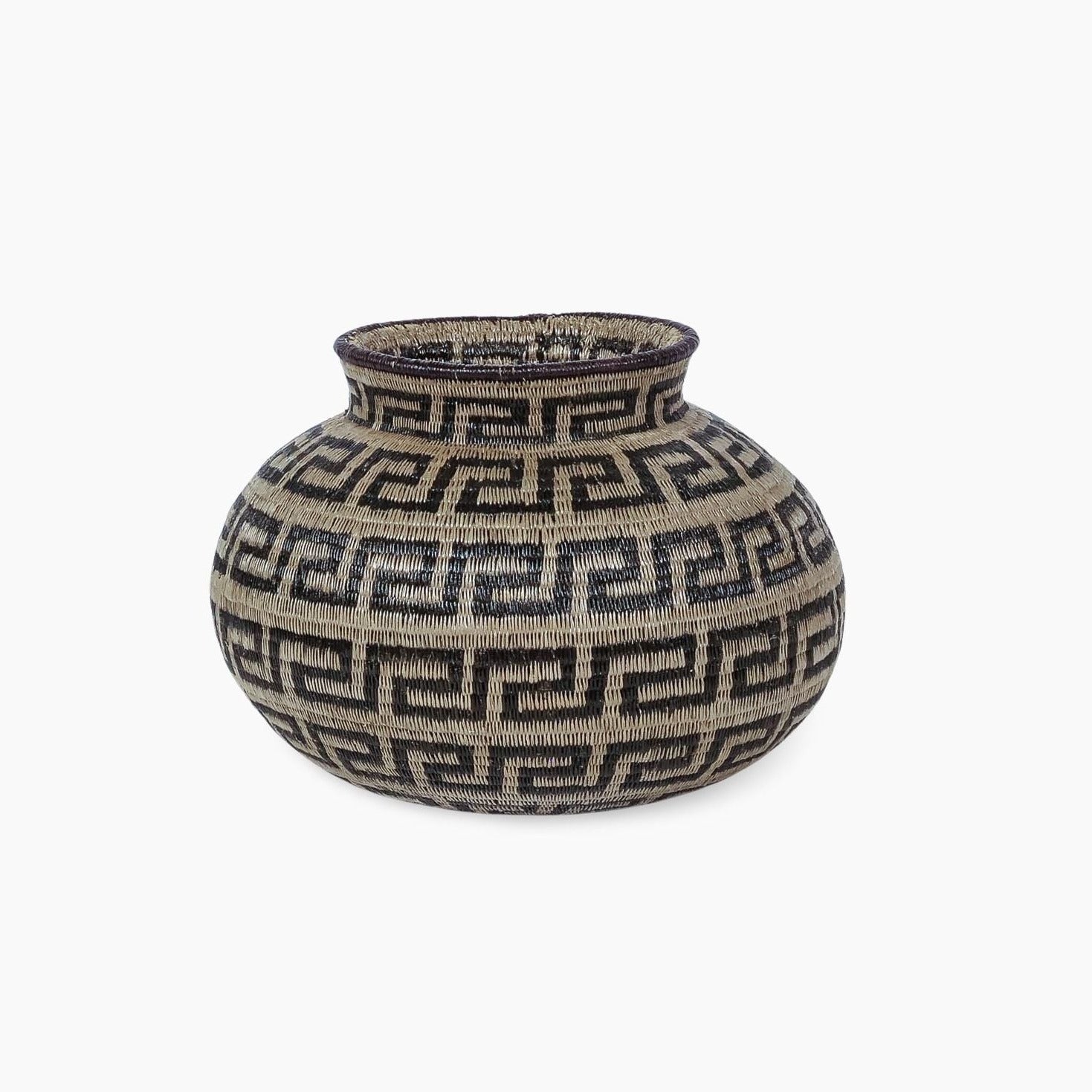 A tightly woven maze pattern gives this basket visual depth and texture. The grounded palette emphasizes form, craft, and precision.