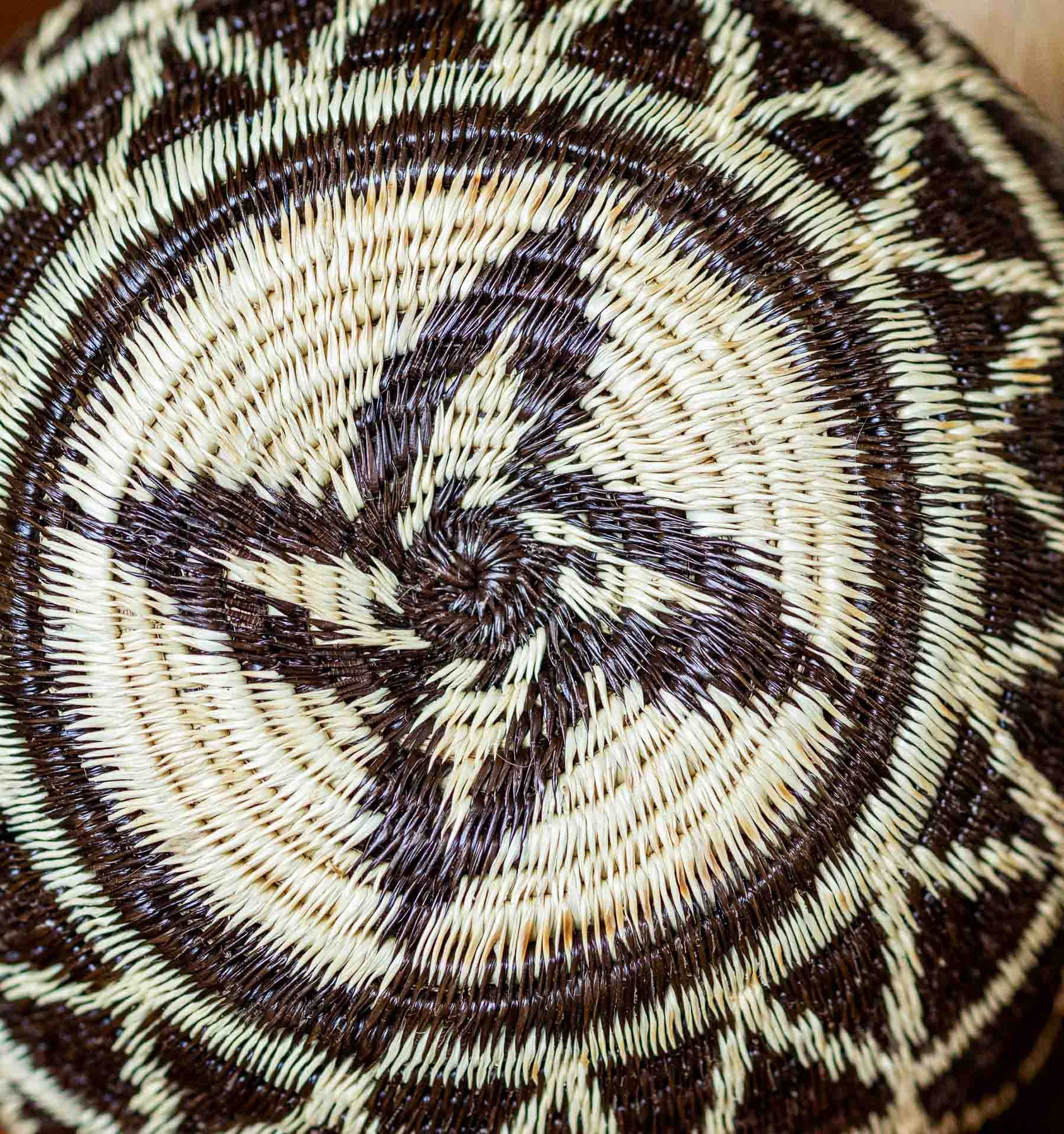 A striking Wounaan basket handwoven in Panama, the Starlight Whirl captures motion in stillness. Dark palm fiber spirals outward into a four-point star, surrounded by precise diamond latticework in natural cream and brown. Each stitch is crafted with split palm dyed and woven by hand, carrying generations of Indigenous technique. A true heirloom piece, designed to command attention.