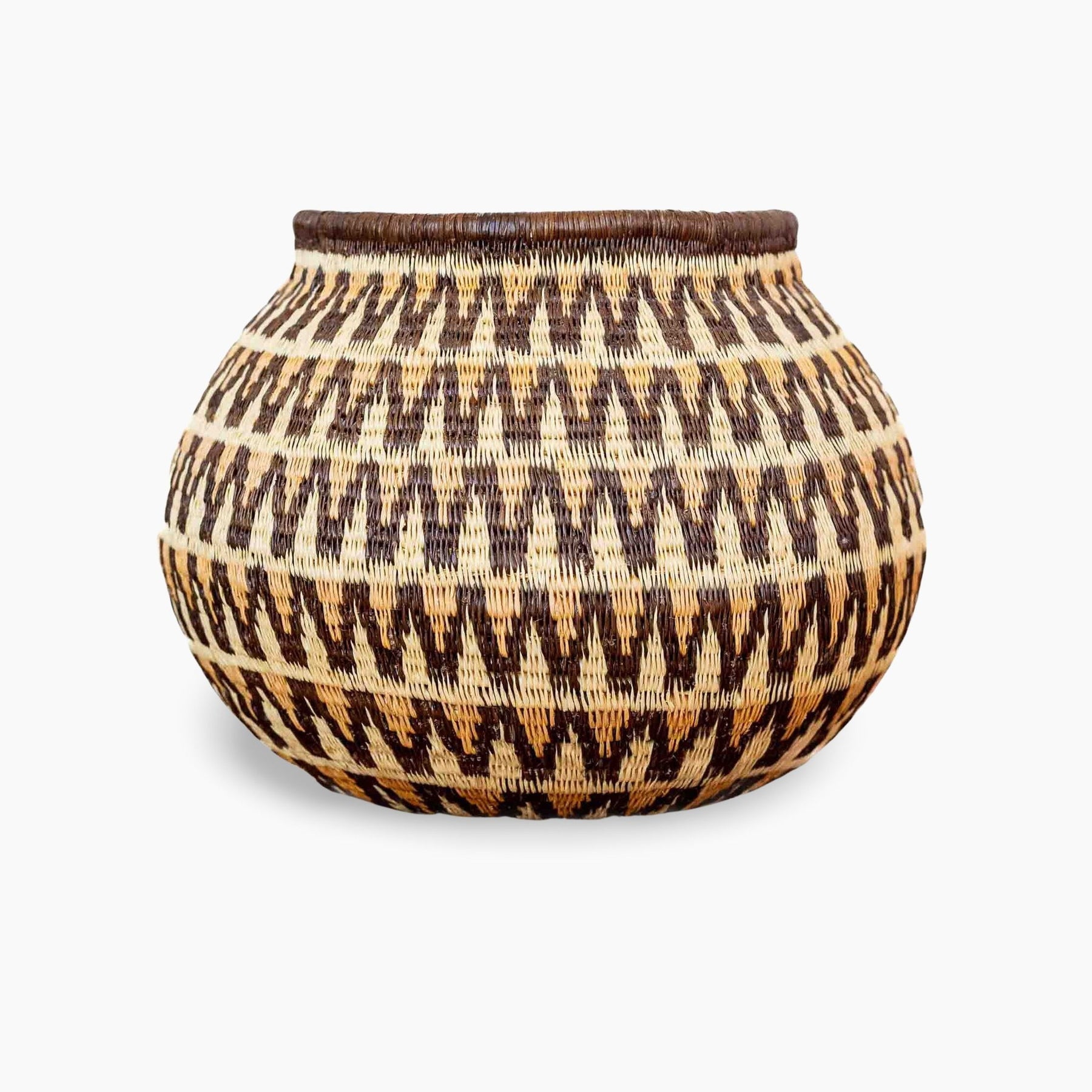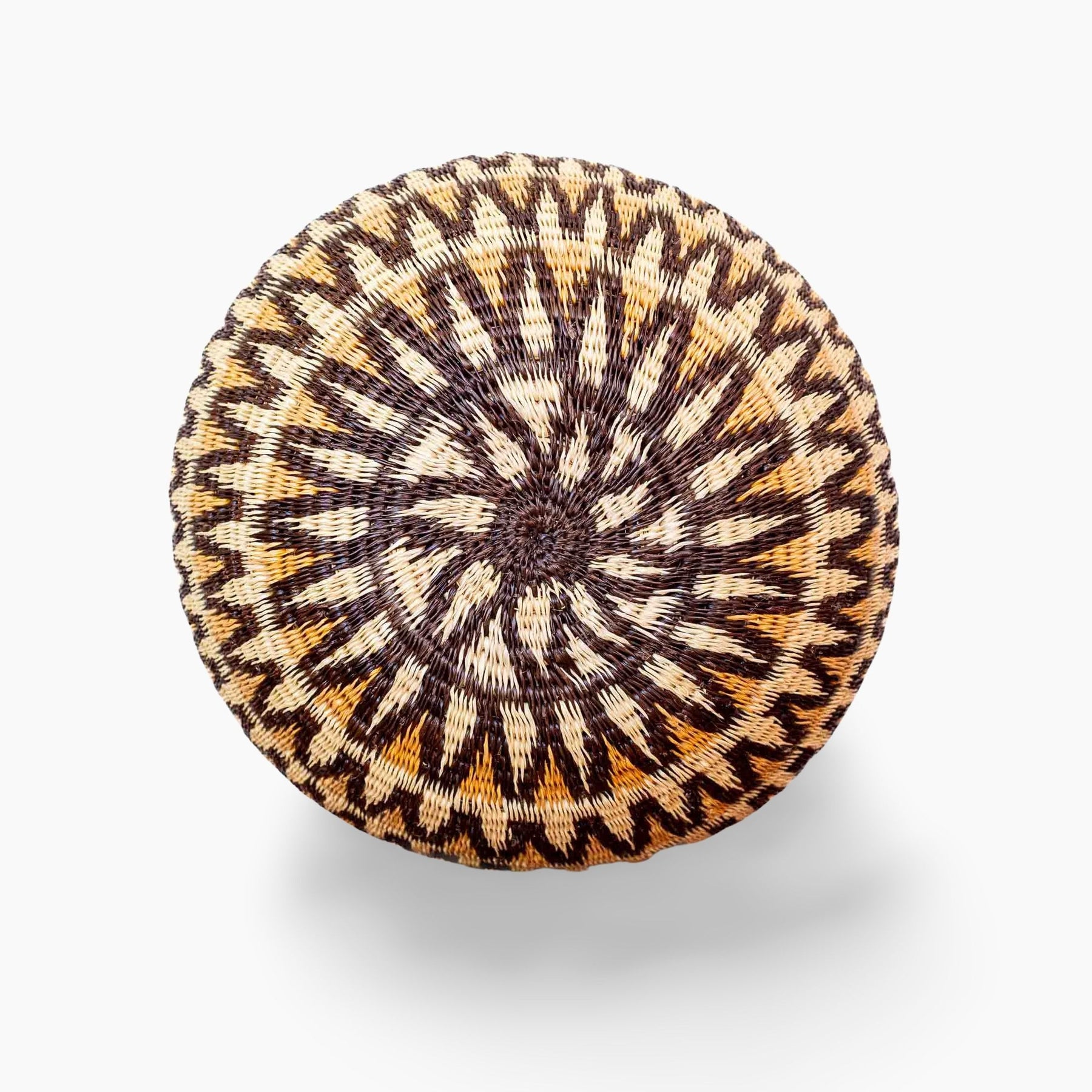 Handwoven in Panama by Wounaan artisans, this basket features a repeating wave-like motif radiating in warm brown, golden tan, and ivory palm fibers. The tight coiling and balanced proportions reflect the skill of recent Wounaan weaving—crafted with a blend of tradition and evolving artistry. Its rhythmic pattern and natural palette make it both a collectible decorative piece and a timeless work of Indigenous design.