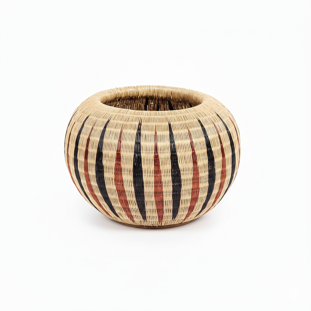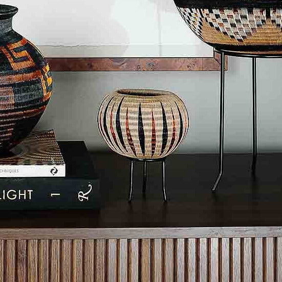 A sculptural Colombian basket defined by vertical rhythm and warm copper tones. Handwoven for collectors seeking refined, organic texture.