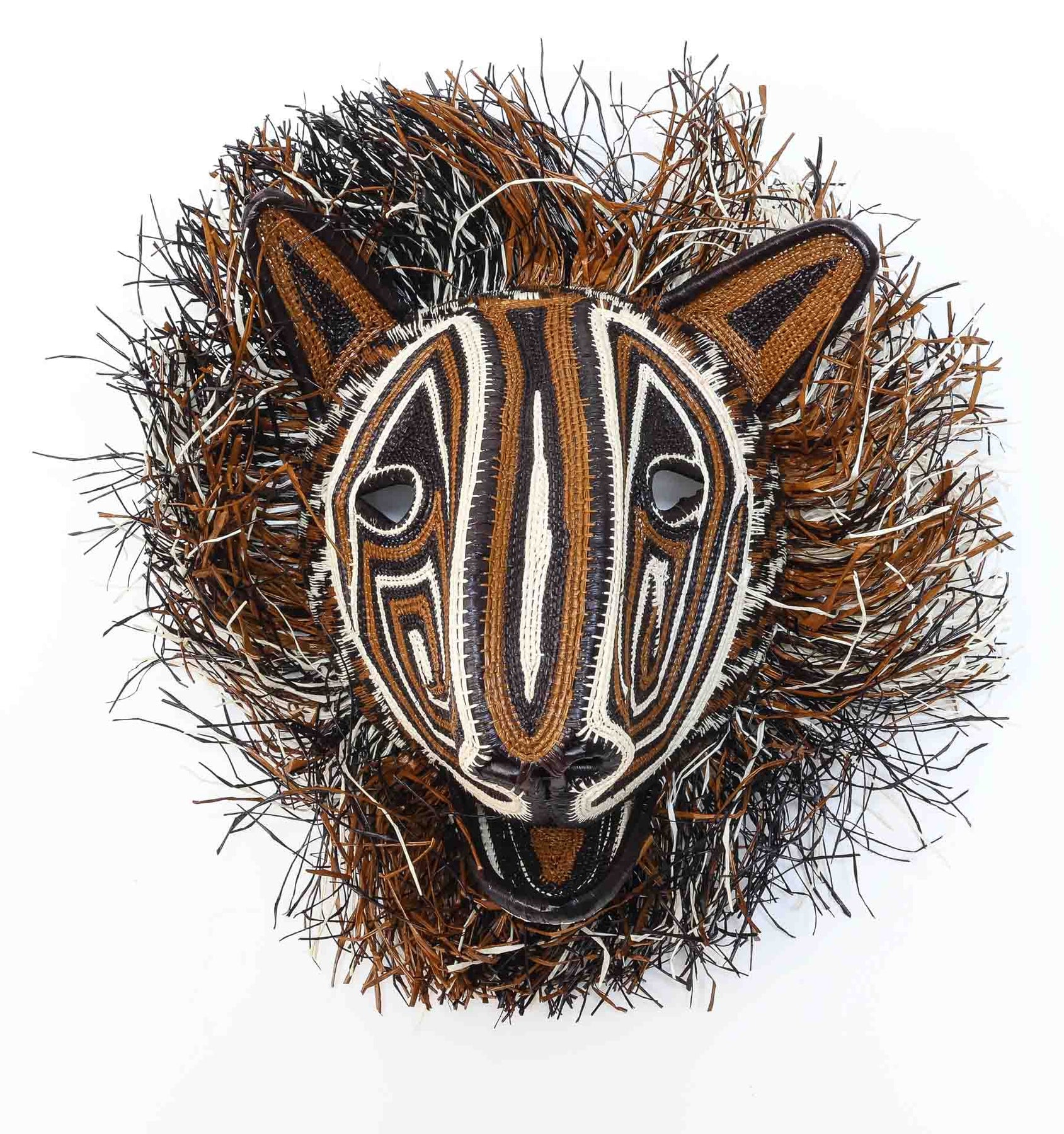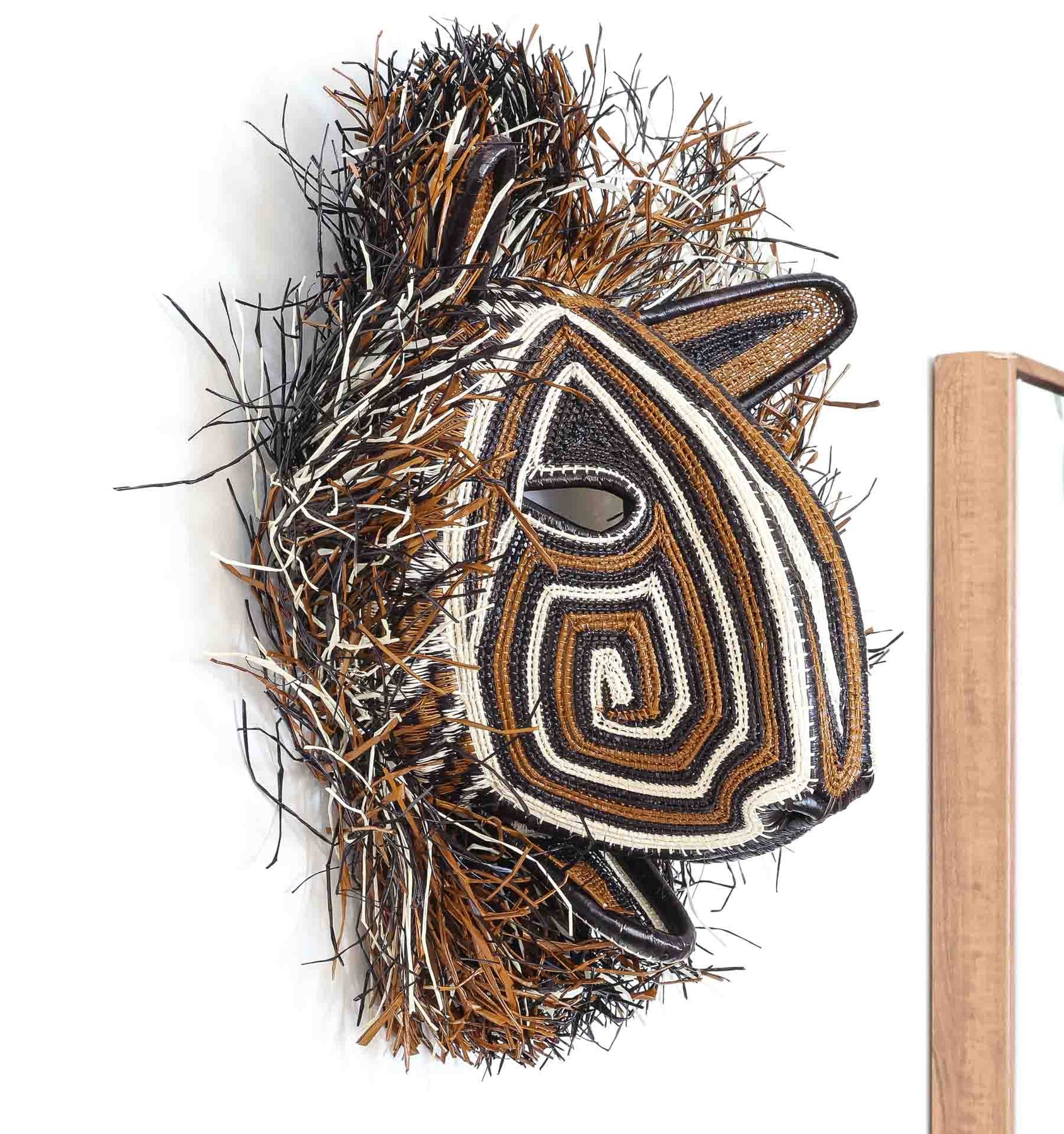 Earthy browns, blacks, and ivory tones zigzag across this woven cat mask, forming bold strata of geometric patterning. The rhythmic flow of stripes creates both movement and depth, echoing the layered landscapes of the rainforest. Framed by a mane of dyed palm fibers, the face emerges with fierce feline presence.